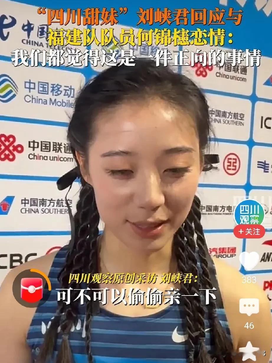 四川甜妹,刘峡君 应对媒体对恋情的疑问 表现得非常成熟,回答更是理性, 值得赞赏 相比亲她的男孩子,显得有些幼稚,在公共场合如此挑逗 情绪化 不利于成绩发挥的 刘峡君认识到问题, 现在大家都应该在体育成绩上有所突破 没有成绩,别提感情的事情 拿成绩说事儿刘峡君高考成绩 刘水君 刘潆霞 刘嘉君