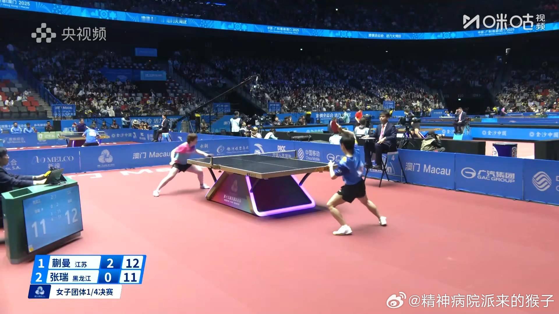 蒯曼3比0张瑞(3,4,12)决胜盘:钱天一VS王曼昱江苏队二比二黑龙江队2025年第十五届全运会女团¼决赛
