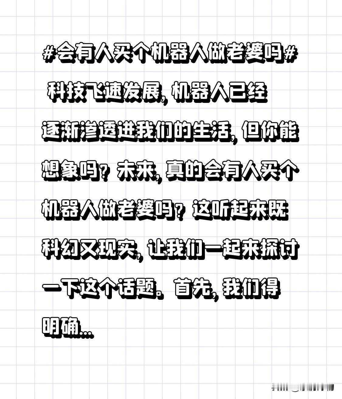 科技飞速发展,机器人已经逐渐渗透进我们的生活,但你能想象吗?未来,真的会有人买个机器人做老婆吗?这听起来既科幻又现实,让我们一起来探讨一下这个话题。 首先,我们得明确,机器人老婆这个概念,并不是简单的机器人伴侣。它意味着高度智能化、情感化,甚至可能具备与人类相似的情感反应和互动能力。想象一下,一个能陪你聊天、解闷,甚至在你需要时给予你温暖拥抱的机器人,是不是听起来很诱人?然而,这背后也隐藏着诸多争议。有人认为,机器人无法替代真实的人类情感,它们只是按照程序运行的机器,缺乏真正的感情和灵魂。但也有人持乐观态度,他们认为随着技术的不断进步,机器人有望在未来达到与人类相似的情感水平。此外,机器人老婆还可能带来一系列社会伦理问题,比如婚姻观念的变革、家庭结构的调整等,这些都是我们需要深入思考的。 机器人老婆这个话题,既充满科幻色彩,又引发我们深思。它究竟会成为现实,还是仅仅停留在科幻作品中呢?欢迎大家在评论区留下你的看法,一起探讨这个有趣的话题!人机器人价值 女性机器人 美女妻子机器人 ai机器人老婆