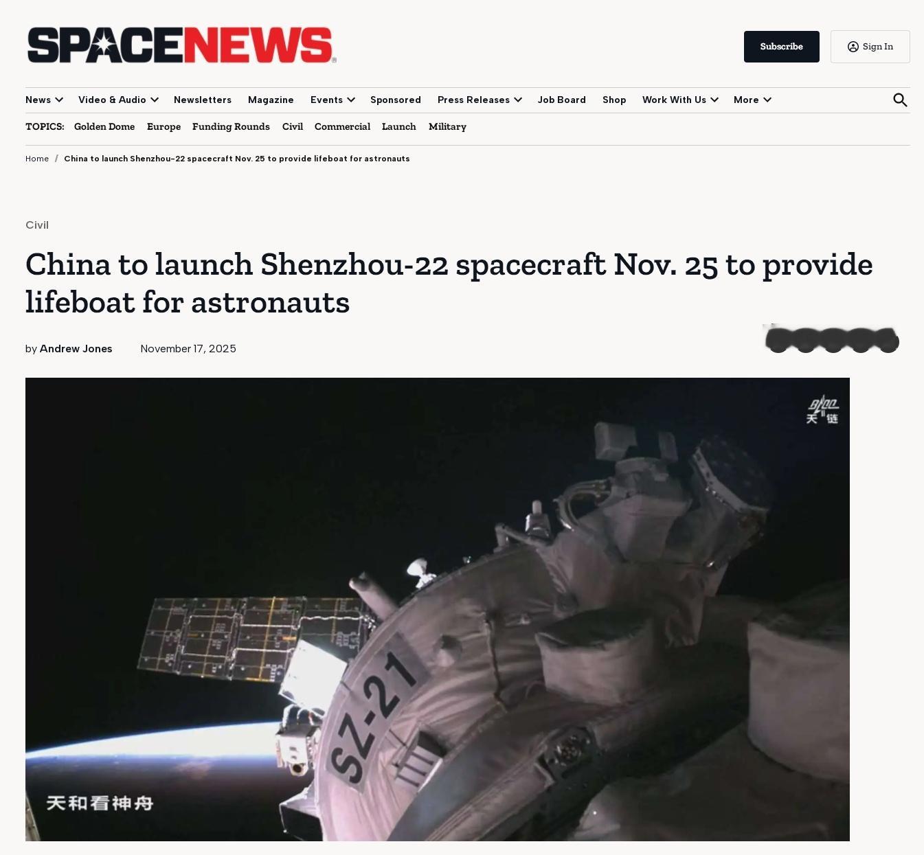 供参考。【外媒:中国🇨🇳将于2025年11月25日发射神舟二十二号飞船,为航天员提供应急救生飞船】来源:space news.com的消息,2025年11月17日发布的空域关闭通知显示,中国正准备于世界协调时间(UTC)11月25日在戈壁沙漠的酒泉卫星发射中心使用长征二号F运载火箭发射神舟二十二号载人飞船。中国载人航天工程办公室尚未公开宣布该计划。此前因太空碎片损坏神舟二十号飞船,神舟二十号乘组于11月14日启用刚抵达的天宫空间站返回地球。这意味着神舟二十一号乘组在遭遇天宫空间站失压或火灾等灾难性紧急情况时,将面临缺乏应急逃生飞船的措施。