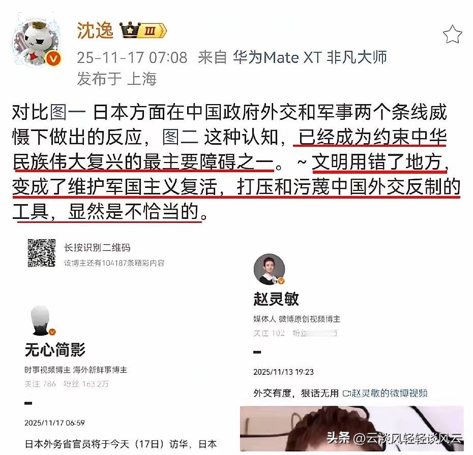 网红赵灵敏在抖音上发视频说,要中国人体谅高市早苗,多从对方立场考虑,还说高市早苗为日本考虑无可厚非,要尊重其人格。这样的逻辑简直荒唐至极! 按照这个逻辑,这世界上就不存在是非曲直,更没有什么正义与非正义之分。犯罪分子都有其自身的立场、缘由和出发点,难道对杀人、纵火、强奸等罪犯都应该予以理解和尊重? 这与西方特别强调尊重罪犯的人权而置受害者的人权于不顾是一个套路。 她的视频标题叫:“外交有度,狠话无用”,也很有迷惑性,同样的话岂不是更适合用在高市早苗身上,她可是比外交官身份高得多的涉及“外交”的人员。