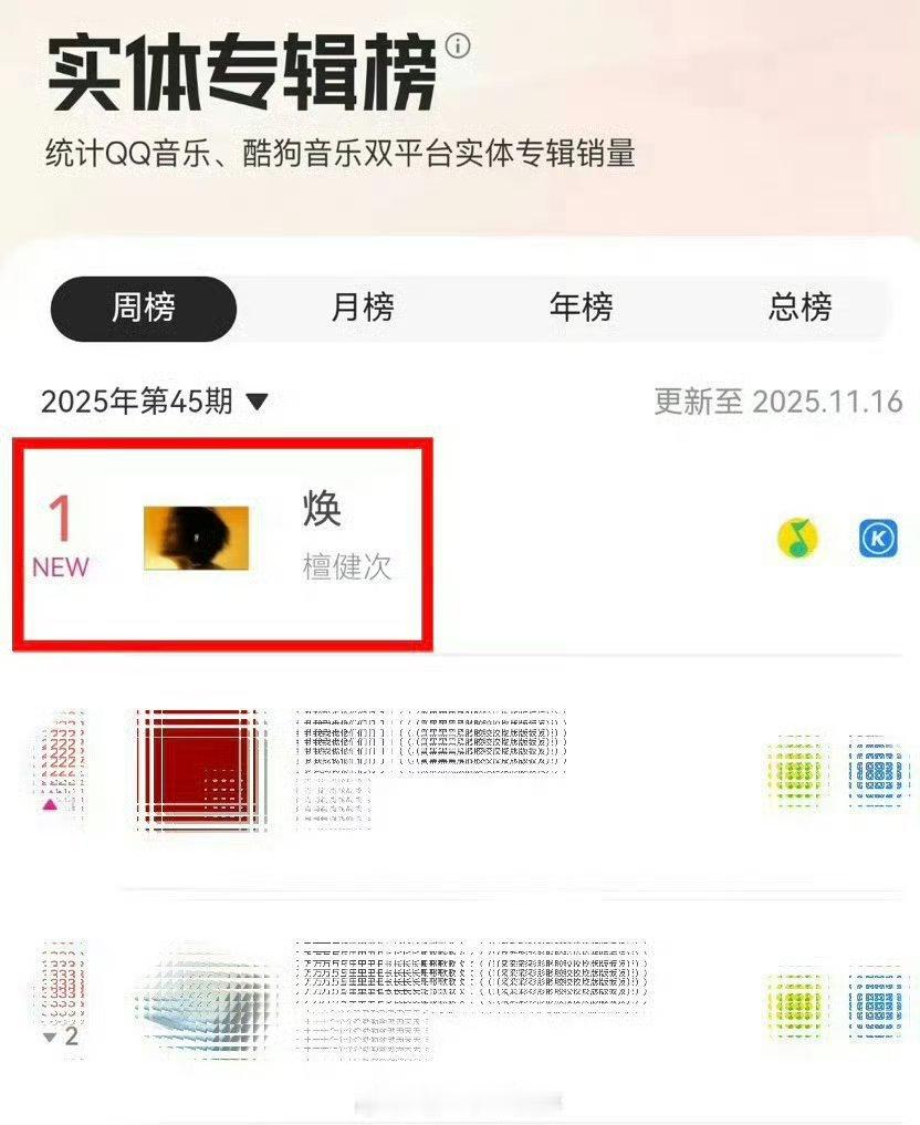 檀健次二专实体 《焕》拿下腾讯音乐实体专辑榜周榜top1,这个超强号召力🐮