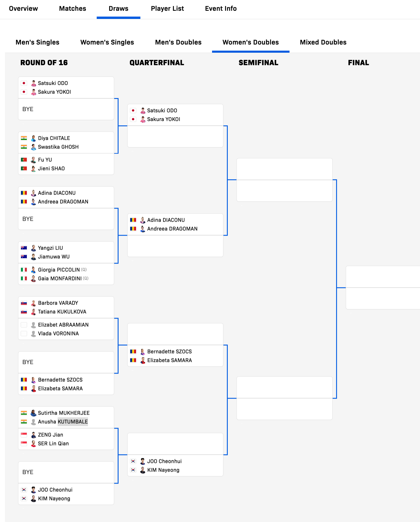 WTT球星挑战赛马斯喀特站丨女双正赛签表【1/4区】横井咲樱/大藤沙月🇯🇵、奇塔莱/戈什🇮🇳VS付玉/邵杰妮🇵🇹【2/4区】迪亚克努/德拉戈曼🇷🇴、刘杨子/佳木娃🇦🇺VS皮科林/蒙法蒂尼🇮🇹【3/4区】瓦拉迪/库库洛娃🇸🇰VS沃罗宁娜/阿布拉米安(AIN)、斯佐科斯/萨马拉🇷🇴【4/4区】库图姆巴莱/S·穆克吉🇮🇳VS曾尖/舒麟茜🇸🇬、朱芊曦/金娜英🇰🇷