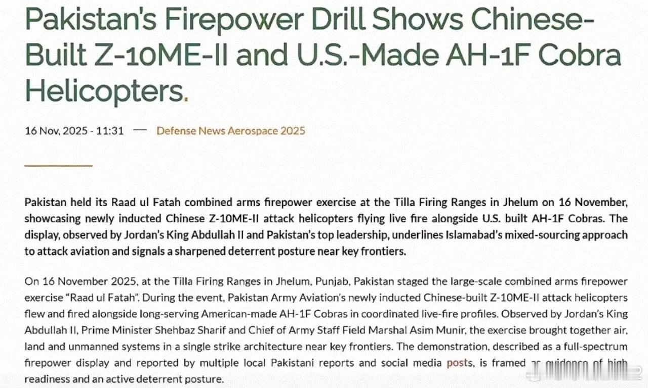 霹雳火 & 眼镜蛇“法塔赫联合火力演习”中,中国WZ-10ME-II“霹雳火”引导美国AH-1F“眼镜蛇”进行攻击行动。巴基斯坦将空中、陆地和无人系统整合成一个单一打击架构,还包括火箭炮、榴弹炮、坦克、步战车等机械化编队,另有FPV和UCAV无人机等。WZ-10ME-II武直,信息化水平非常高,其搜索瞄准能力强悍,完全可以引导指挥AH-1F发射导弹火箭弹等武器,可以继续发挥平台作用。这也是巴基斯坦钱少办实事的表现。此次演习,巴基斯坦军政最高层陪同约旦国王参观巴陆军新型战术协同演习。其实约旦也拥有为44架美制AH-1E/F“眼镜蛇”,虽经改造延寿,但与以色列、沙特等国的先进武直差距巨大。约旦曾经求购美国AH-1Z蝰蛇最新型武直,单价1亿美元起步,30架太贵。欧洲武直高原性能也又差。这次小巴这么安排,妥妥是在给WZ-10ME-II开拓约旦市场助力啊!