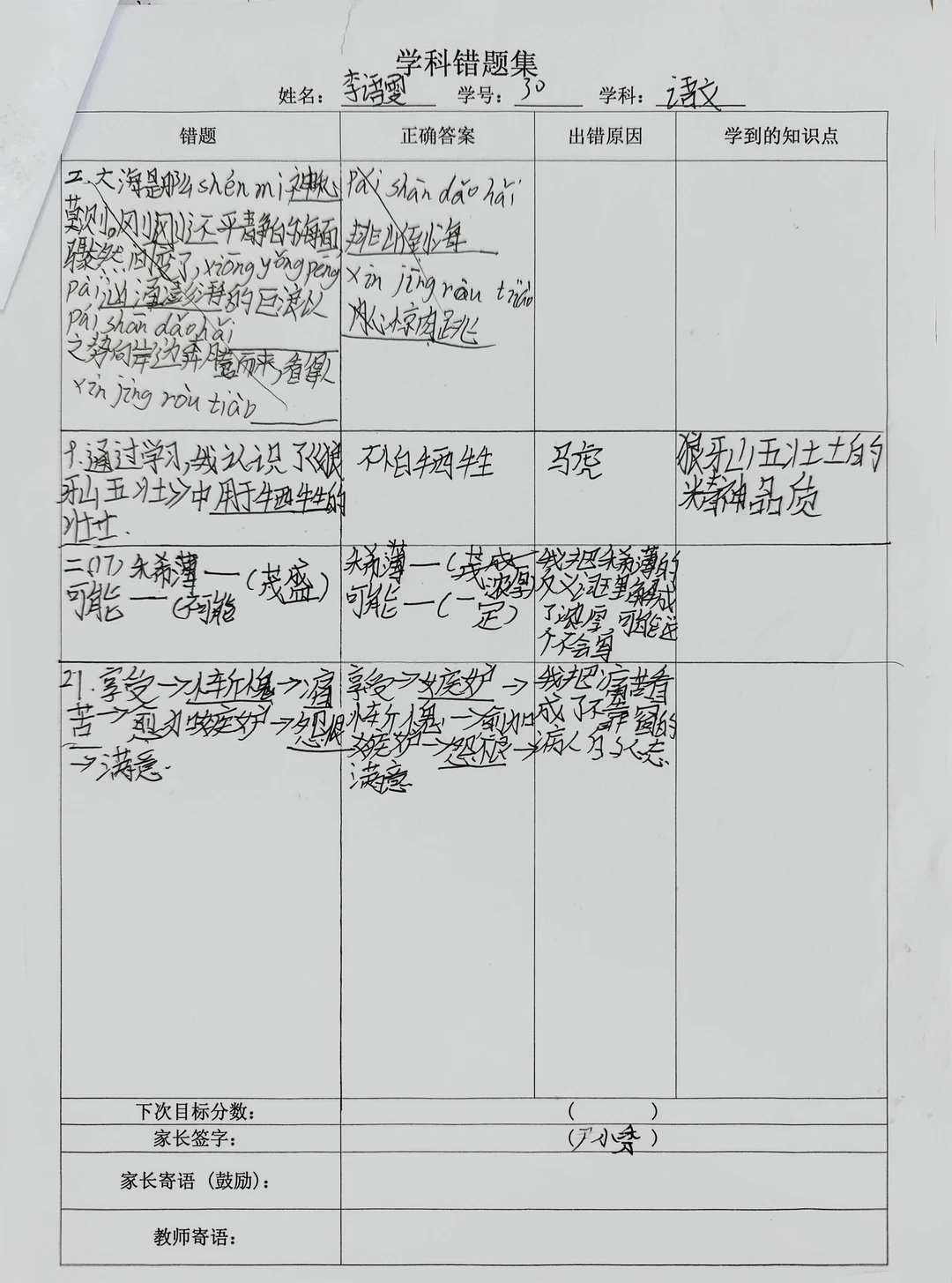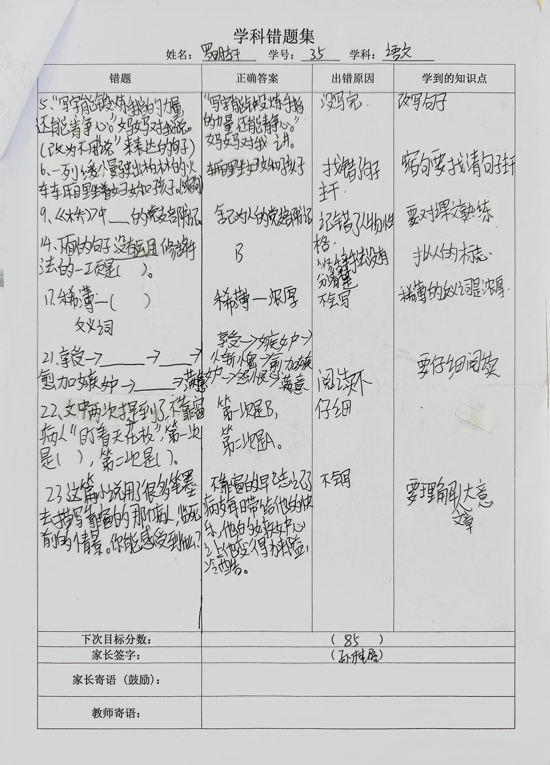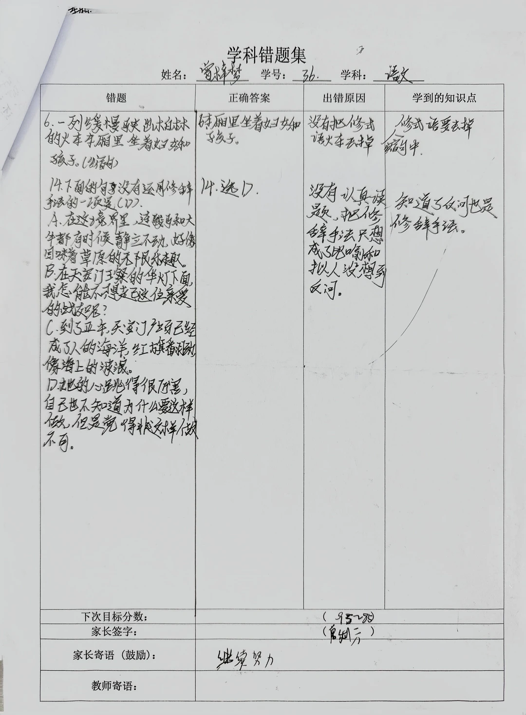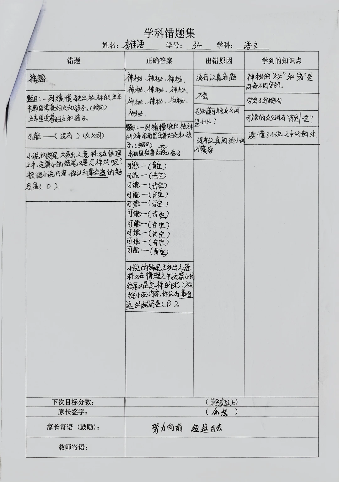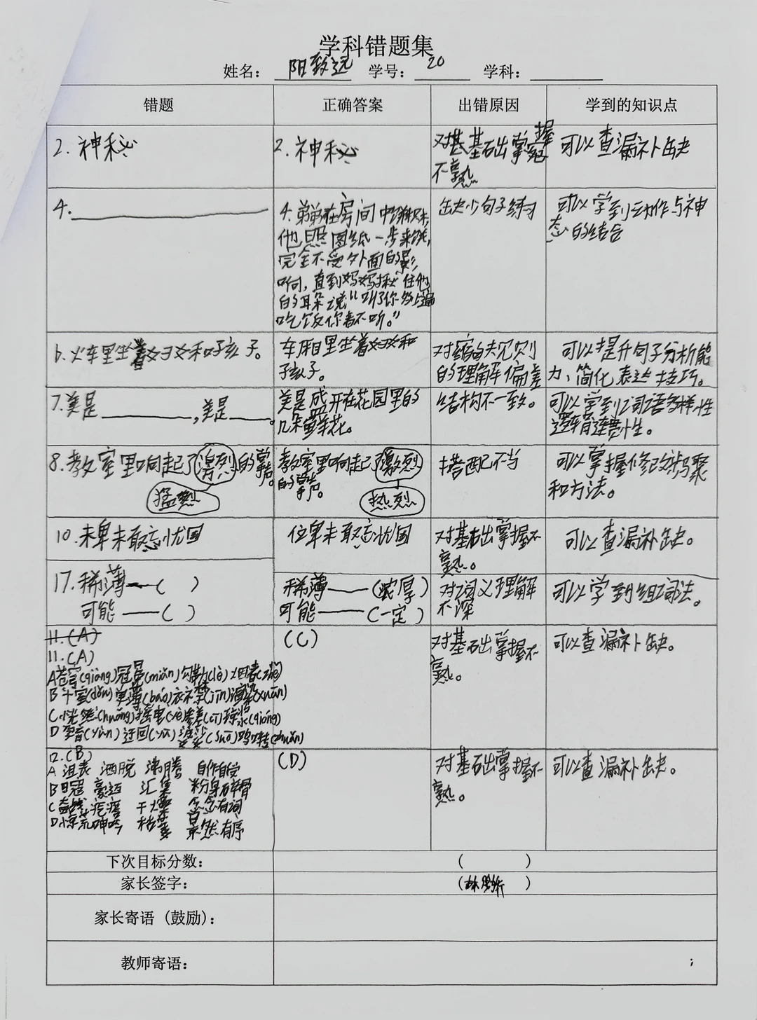 讲完试卷,验证娃们有没有弄清楚出错的原因,吸收所讲的知识点,错题集的整理是个很好的学习方法!