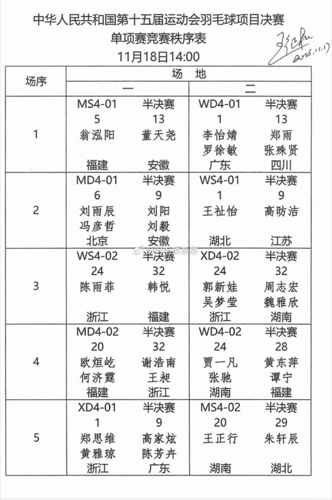 十五运会羽毛球单项半决赛对阵今天下午2点挥拍