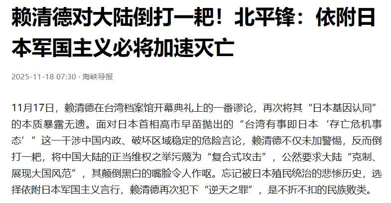 对于大陆批高市早苗,赖清德竟妄称,“中国对日本复和式攻击,严重冲击印太和平稳定;也呼吁中国克制,不要成为区域和平稳定的麻烦制造者,应该要回到以规则为基础的国际秩序轨道上。” 其实赖清德根本没把精力放在保护台湾,而是一头扎进日本和美国的军事圈子里。最让人关注的是,那枚日本计划年底前放在石垣岛的新式导弹,距离台湾非常近,真正瞄准的就是台海。 赖清德面对这些实质性的威胁并没有半点反对,反而不断推动合作,把台湾的安全问题和美日利益绑在一起。 日本自卫队悄悄和台军在冲绳海域试联通技术,说是救灾,实则在做磨合。更厉害的是,台湾立法机构还通过了新规,让日本自卫队可以以“顾问”身份直接进驻台军基地。台海紧张气氛不断升级,台湾民众的安全感也在一点一点被蚕食。 赖清德政府为了和美日靠拢,要求芯片企业离开大陆,跑去日本和美国建厂。结果台积电在日本不仅没赚钱,还一年亏掉了大几百亿。 原本能给台湾带来收入的产能消失了,半导体行业的就业压力一下子加重。让人更郁闷的是,这种损失对台湾普通人影响很大,每一个失业的数据背后都是家庭的压力。 农民的日子也不好过,日本随时说不买台湾凤梨酥和释迦就不买,台湾农民靠出口养家,收入一下大幅下降。 赖清德政府却没有帮农民据理力争,反而拿大钱补贴在台日企,还要求农民改用日本指定的农药,种地成本涨了,市场还没了保障,农民只能被动接受。 除了经济,赖清德还在历史和文化上下了功夫。抗战纪念日这天,他用“终战”这样的词语,淡化历史,台湾的历史课本里有关抗日的内容也被删得干干净净。现在年轻人对抗战历史越来越陌生,越来越多认同台日关系比两岸关系好。 日本驻台机构每年资助几百个校园社团,推广亲日、远离中国的观念,连日资企业都在台湾办学校,员工子女优先入学,在文化上不断加深“靠拢日本”的氛围。 联合国明确表示坚持“一个中国”原则,东盟国家也反对分裂,连美国前驻华大使都警告,赖清德的做法只会让台海气氛更加紧绷。 赖清德试图让自己看起来是在维护和平,实则把台湾推向了危险的前沿,真正受苦的依旧是台湾普通民众。 如今的台湾,政令一变,民众的担忧迅速滋生。赖清德一门心思要迎合美日,背后却是牺牲经济、丢掉历史、让台湾变成他口中的“国际规则”的筹码。 台湾的未来和岛内民众的利益已然被他抛到身后,他选择站队美日,最终受伤的还是这个岛上每一个扎根生活的人。