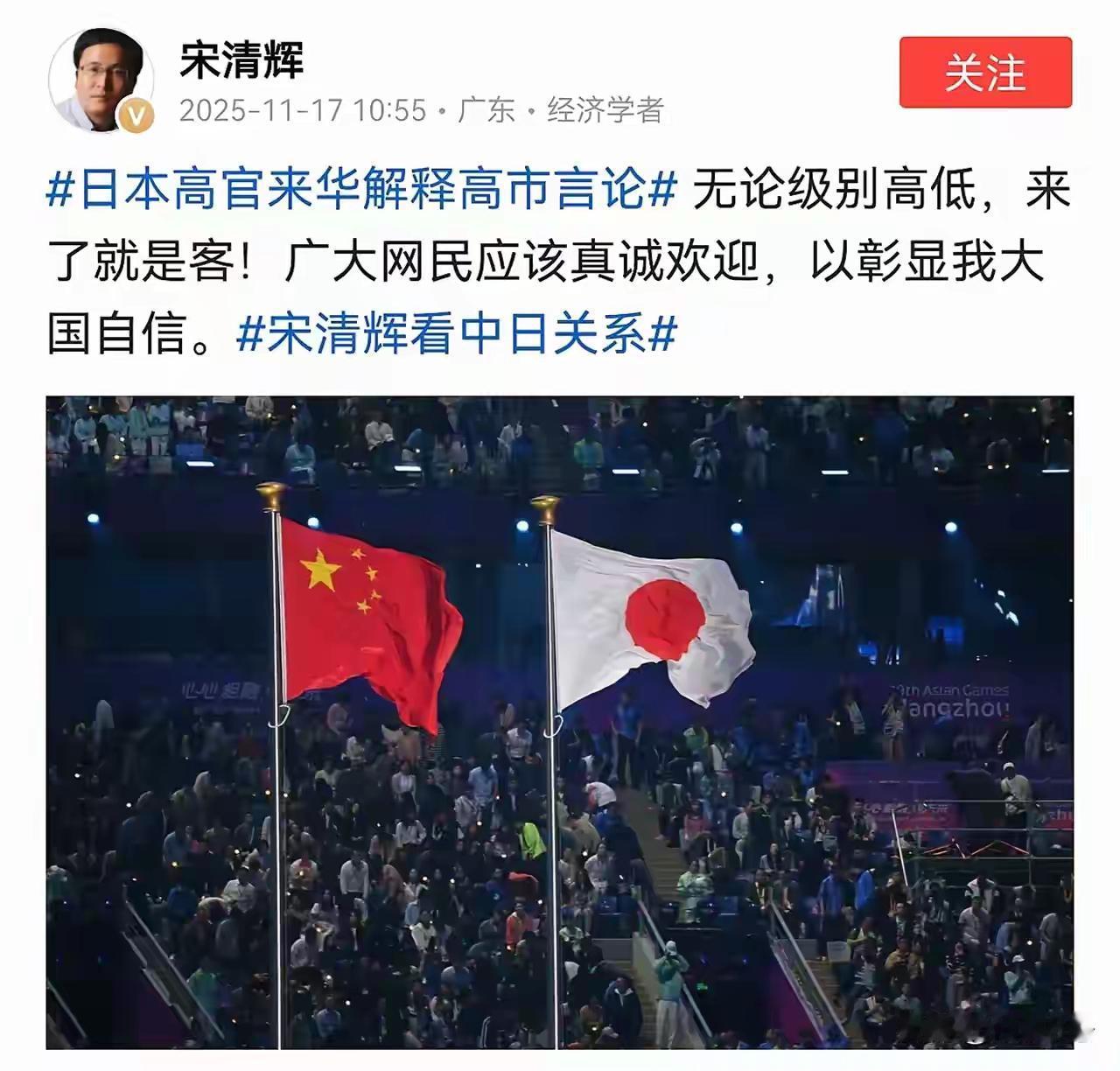 人在做天在看,宋清辉为什么会绝后,看看他干的事就知道,他说日本高官来华解释高市言论,无论级别高低,来了就是客!广大网民应该真诚欢迎,以彰显我大国自信。他在说什么胡话他知道吗?来的是朋友有酒有肉,来的是豺狼就直接打死!