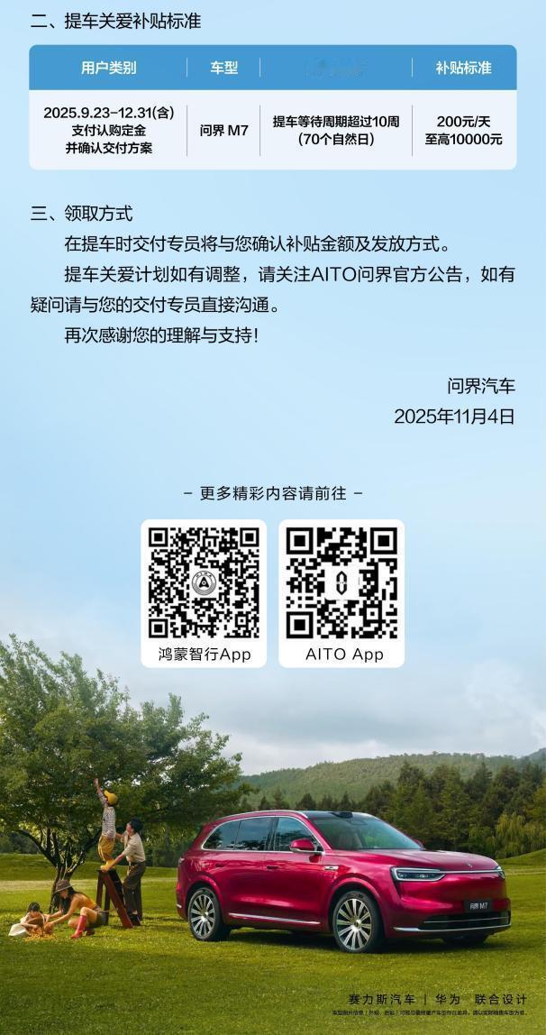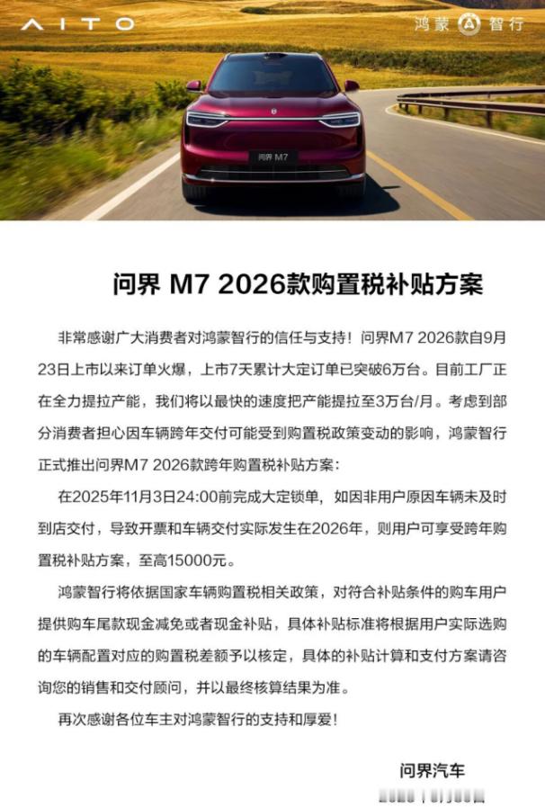 日补200元+购置税补贴兜底:全新问界M7推出“提车关爱计划”提到全新问界M7推出的“提车关爱计划”,就不得不说它的销量了,新车上市41天拿下9万订单,这不是一般火爆。可订单太多也带来了幸福的烦恼——交付要排队。但问界早就想到了解决办法:等车超过70天,每天补贴200元,最高能拿到1万元。这招妙在哪里?说白了,就是把不可控的等待时间,变成了明码标实的补偿方案。对企业来说,单客最高1万元的补贴是个可控成本,却能有效稳住订单。对用户来说,等待不再是遥遥无期的焦虑,而是有了实实在在的保障。更聪明的是,他们还同步推出了跨年购置税兜底,11月3日前锁单最高再补15000元。这两招组合在一起,相当于给用户吃了一颗定心丸:你安心等着,万一延迟了,我们来承担风险。仔细想想,这其实反映了新能源汽车行业竞争的新趋势。以前大家比的是续航、智能这些硬实力,现在连等车这段时间的体验都成了新的竞争维度。能把用户等待时间量化成具体价值,这本身就是一种创新。说到底,现在的消费者要的不仅是好产品,更是被尊重的感觉。问界这波操作,等于是把用户的等待时间明码标价,用真金白银表达了诚意。这种把短期压力转化为长期品牌价值的思路,确实值得点个赞。毕竟,能把危机变成转机的企业,才是真正懂市场的!全新