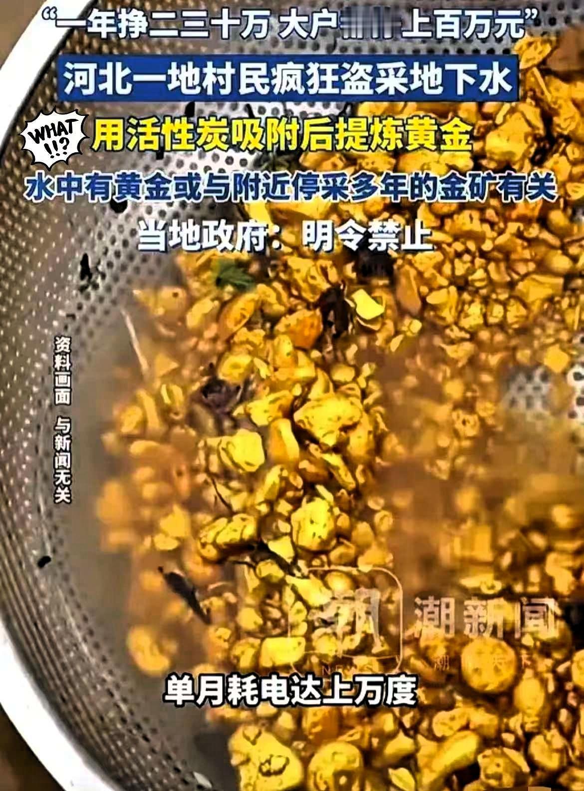 “贪心不足蛇吞象!”河北,一村民抽地下水使用,竟在水里发现了黄金 他没上报,而是自己在院子里打了口深井,专门抽水提炼。消息传开后,村里上百户人家都动了心,跟着纷纷打井。 大家用活性炭吸附水中的黄金,抽出来的废水直接排进村边的河里,为了多提炼,用电也格外多,单户一个月电费就超过一万度。 之所以这么投入,是因为这活儿来钱快——普通人家三个月能净赚四五万,村里几个规模大的,一年能收入上百万。 但这种做法的代价很快显现。周边五十多户人家的吃水井陆续干涸,村民喝水得去老远的地方挑。村边的河水被重金属污染,颜色变深,水质也差了。 更让人担心的是,村里不少孩子体检时,查出了重金属超标,对健康有潜在影响。 另外,长时间大量抽取地下水,导致当地出现了地面沉降的迹象,有些村民家的院墙甚至出现了裂缝。 有人说可以靠罚款制止,可实际罚款金额和他们的收入比起来,差距太大,根本起不到震慑作用。很多人明知道不对,还是抱着侥幸心理想赚快钱。 咱老百姓过日子,图的是长久安稳。地下水是全村人的共同资源,土地也是子孙后代要依靠的根基。今天为了眼前的利益,把水抽干、把环境破坏了,不仅现在的生活受影响,将来孩子们的日子也没法过。 这不是淘金,是在透支家园的未来。