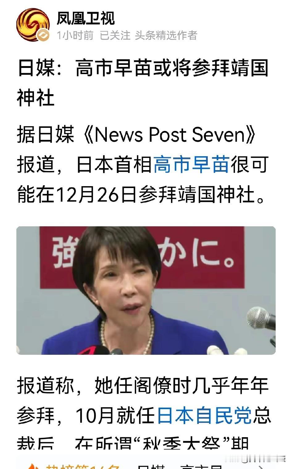 高市早苗一波未平一波又起,她又要拜鬼去了! 继高市早苗“有事论”发生后,其不但没有撤回此言论的表态,其内阁成员甚至直言表示,不会撤回! 此举引起中国人民的极大不满和愤慨,且纷纷喊话高市早苗“一言为定”,这也体现了中国人民维护国家统一的决心。 事件发酵不断,随后日本方面紧急派人来中国磋商,实则是进一步探听中方的虚实,好为其狂躁言论找到合理的解决方法。 但日媒紧接着又爆出,高市早苗大概率要在12月26日去神厕拜👻,这是真的一条路走到黑的节奏。非但没有为自己的言论做出说明,反而更加激进要去拜鬼。其心可诛也! 所以对日方的反制措施应该继续加大,全方位的反制! 日本 日本首相高市早苗为何屡次挑衅中国 高市早苗内阁 高士早苗 高市早苗演技派 高市早苗下台 中日关系未来的发展方向会如何