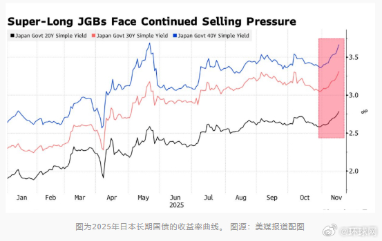 【美媒:高市早苗经济刺激计划引发担忧,】据美国彭博社报道,由于投资者愈发担忧日本首相高市早苗所提出的一项大规模经济刺激计划将损害日本公共财政,日本长期国债价格当地时间18日进一步下跌。报道称,日本40年期国债收益率上涨了8个基点至3.68%,创下自2007年发行以来的最高水平。同时,日本20年期和30年期国债收益率均上涨至少4个基点。日本30年期国债收益率距离史上最高水平仅差几个基点。报道还称,日本长期债券价格的暴跌与全球其他债券形成鲜明对比。18日,美国国债和澳大利亚国债收益率均小幅下降。彭博社援引三菱日联摩根士丹利证券公司一名战略研究员的话称,在日本政府将于11月21日提交给内阁批准的经济刺激计划被公布之前,债券购买可能会持续受限。据了解,本月17日,日债市场几乎全线下跌,收益率普遍上行。当天盘中及盘后交易时段,投资者在抛售除3个月期短债以外的日债,其中超长期日债的抛售情绪尤甚,20年期日债收益率涨3.2个基点至2.748%,30年期日债收益率上涨5个基点至3.263%。同时,东京股市继续下跌,17日,日经225种股票平均价格指数收盘下跌0.10%,东京证券交易所股票价格指数下跌0.37%。18日,日本东京股市日经225种股票平均价格指数一度下跌3.3%。