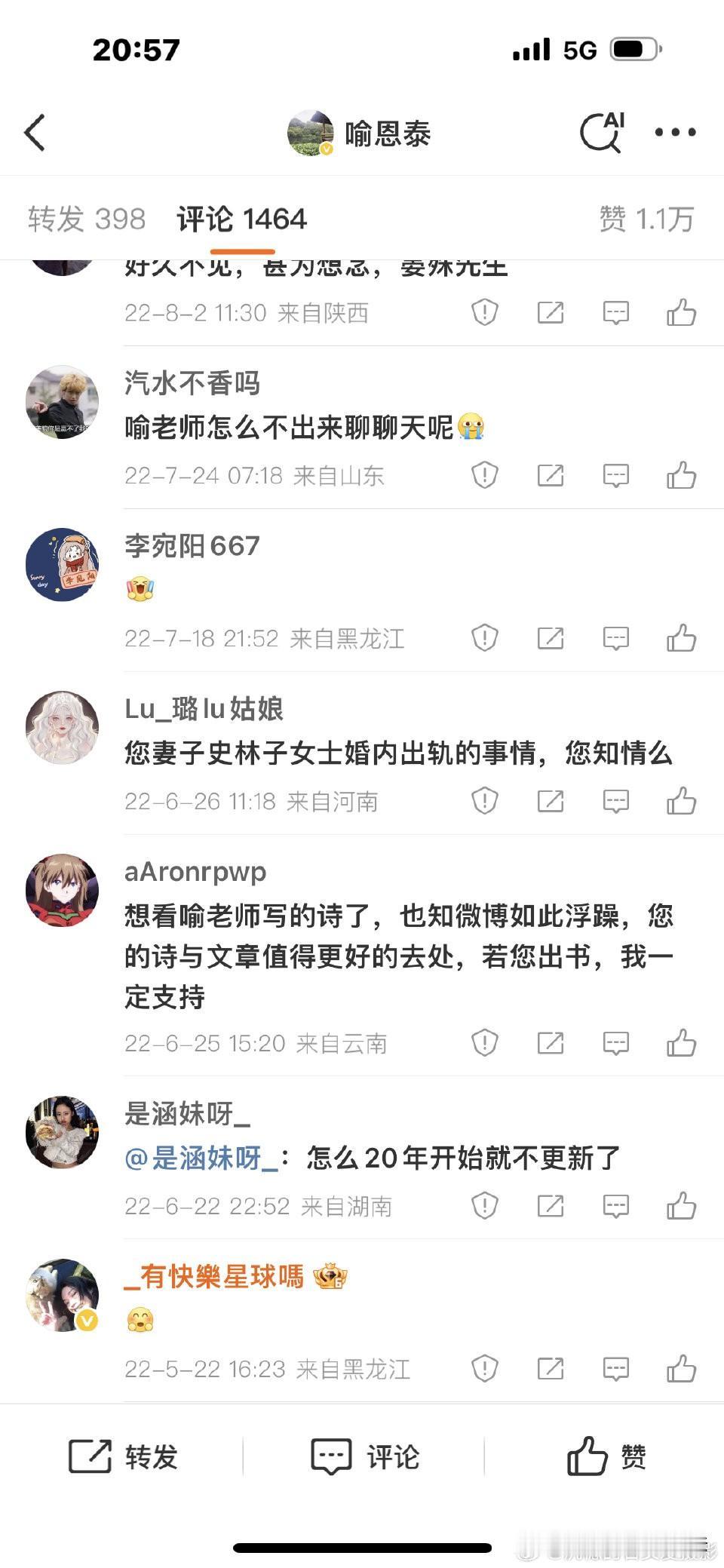 “吸毒、出轨、两个孩子都不是喻恩泰的、多次和多人约P、趁喻恩泰外出拍戏时将出轨对象带回家过夜、和闺蜜团组成反查岗小组互相为出轨打掩护……”,11月18日,自称喻恩泰和史林子共同朋友的网友发声爆料喻恩泰事件真相,称与其纵容一个朋友去诬陷另一个朋友,不如公开真相,并强硬表示,“史林子,你已经不配再做我的朋友了!” 这位网友附上了多张史林子与多位约P对象的聊天记录截图,内容可以说是让人瞠目结舌,如果属实,那卓伟就是在恶意污蔑喻恩泰,喻恩泰实在是太冤了。 截至目前为止,喻恩泰和史林子双方都未回应,所以真相如何我们还不得而知,不过目前形势对喻恩泰很不利,因为之前他不止一次在公开场合对其余女演员有不雅动作,导致相当一部分网友对他持不信任态度,而且聊天记录是真是假也并没有得到权威机构确认,所以还是保留态度,让子弹多飞一会吧。