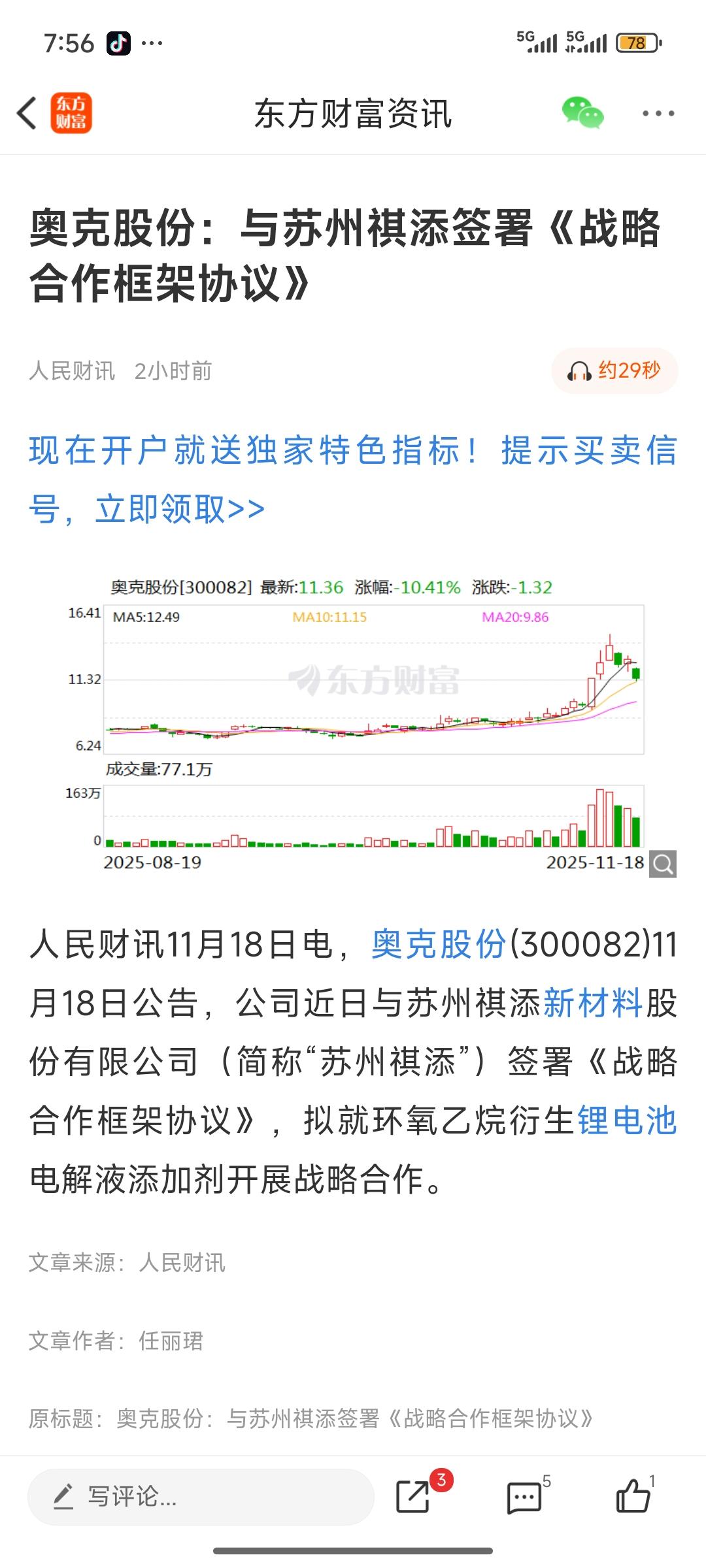 奥克股份在连拉三个大阳之后呢,也迎来了连续三天的这个大幅调整,调整幅度将近上涨幅度的50%,调整幅度应该是够了,调整的量,量能也是充分的,那就是时间稍微短了点。今天收盘发布一个消息就是奥克股份和苏州祺添签署了战略合作框架协议。 苏州祺添产品主要覆盖二十余种电解液添加剂,是目前国内电解液添加剂生产企业中产品种类最丰富的企业之一,客户覆盖国内外头部电解液企业。 苏州祺添的新能源电池电解液添加剂主要产能及产品:现建有 500t/a 乙烯基碳酸乙烯酯vec、6000t/a 硫酸乙烯酯(DTD)、9000t/a 碳酸亚乙烯酯(VC)、6000t/a氟代碳酸乙烯酯(FEC)、1000t/a 甲基二磺酸亚甲酯(MMDS)等。这个应该属于利好消息,应该能够有力的促进,奥克股份的应该反弹。看明天主力的这个操作动向,如果主力高开甚至快速拉涨停,有可能会启动第2波。对,当然对于嗯重仓持有奥克股份的趁着明天如果有冲高机会适当减仓,也是我觉得也是一个比较好的选择吧。 各位股友怎么看待这个消息呢!电解液企业 电解液概念股
