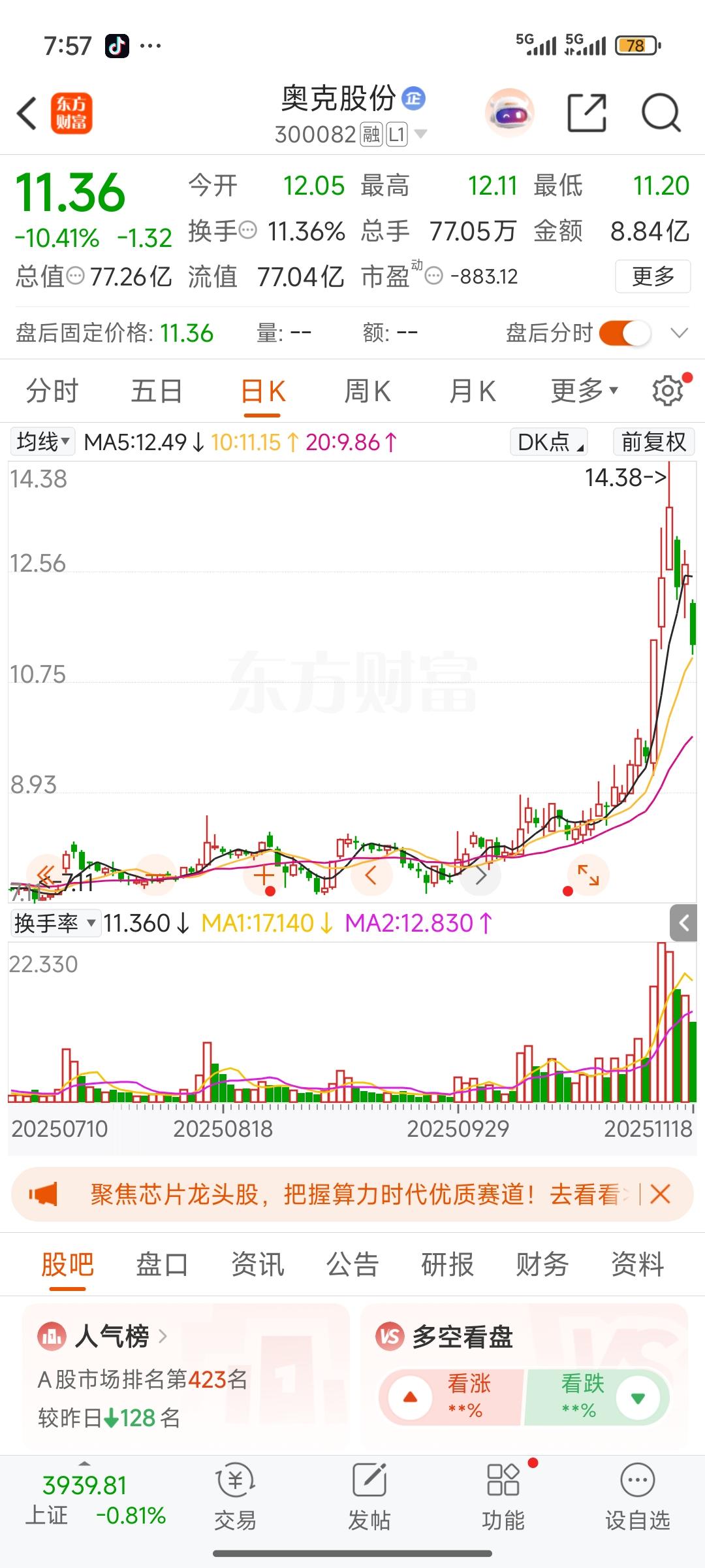 奥克股份在连拉三个大阳之后呢,也迎来了连续三天的这个大幅调整,调整幅度将近上涨幅