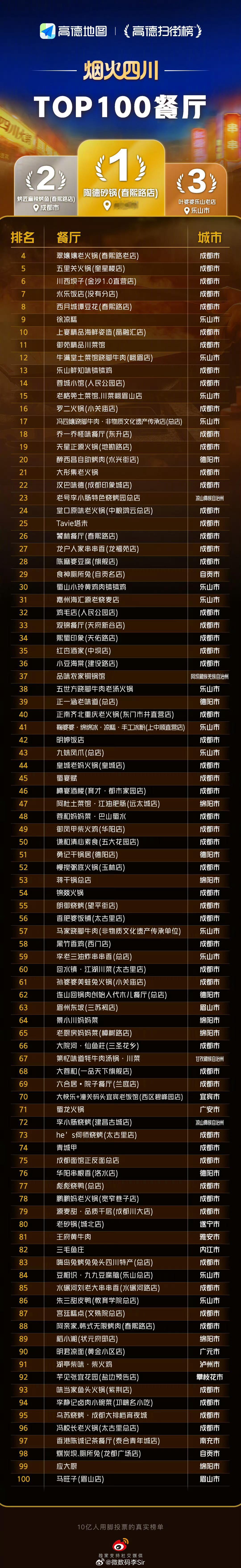家人们谁懂啊!高德扫街榜把四川top100餐厅直接甩我脸上了!从成都街边的爆辣兔腰子,到乐山巷子的跷脚牛肉,再到自贡的“辣到飞起”冷吃兔……地图一点,直接导航开吃!不用再问“哪家正宗”,扫街榜帮你试吃100家,嘴巴都帮你验过货!今天不冲,明天排队3小时别哭!