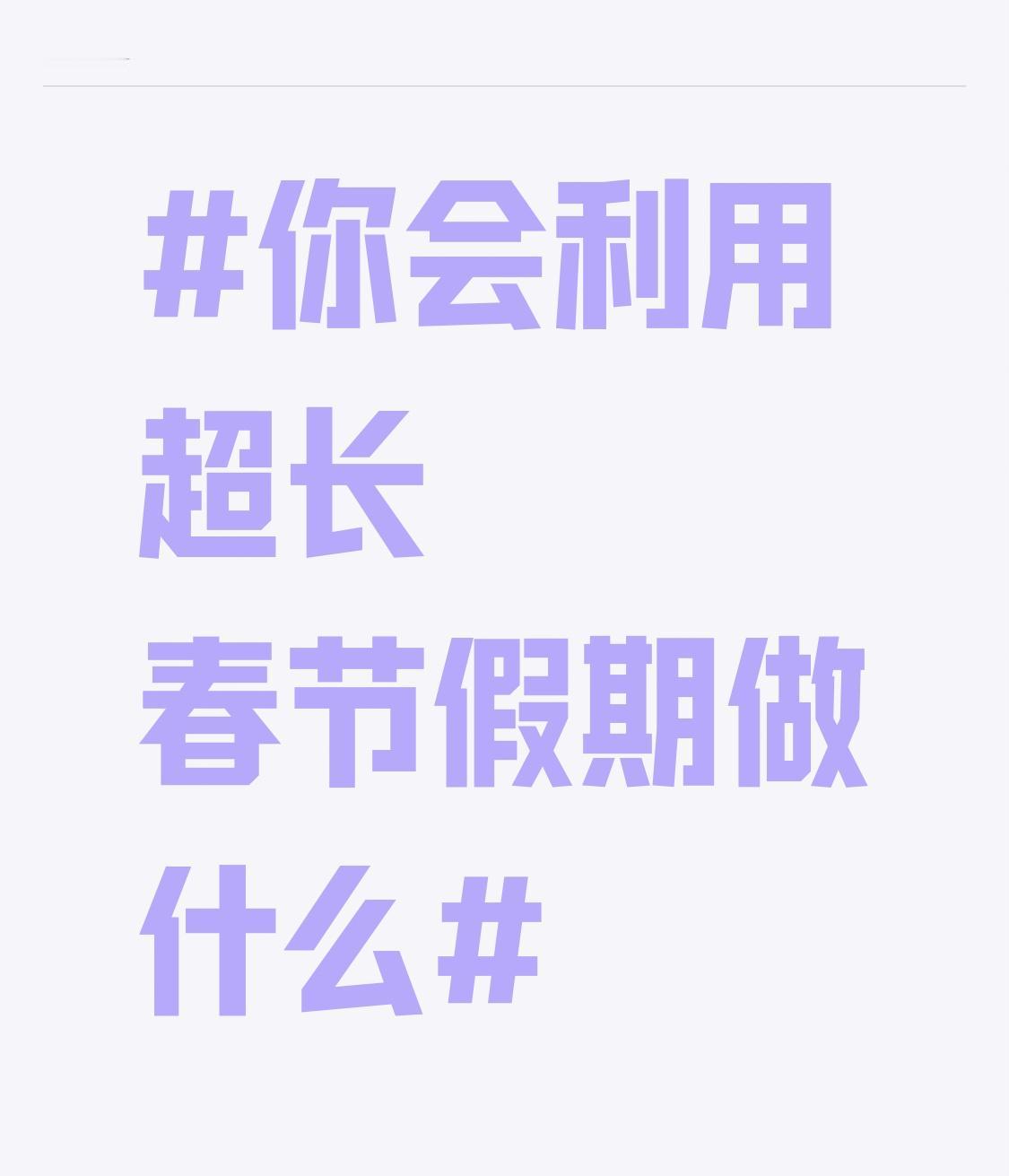 你会利用超长春节假期做什么 超长春节假期能干的事儿可太多了!我打算先把团圆时刻狠狠拿捏。跟妈妈贴春联、包饺子,听爸爸唠叨家常,一家人热热闹闹吃年夜饭、看春晚,这年味儿一下就上来了。 初一到初三走亲访友拜完年,初四去姥姥家,吃她留的腊鱼腊肉、炸酥肉,陪她在村里遛弯。 初五初六带爸妈去周边景点转转,爬爬山、看看景,多拍点合照。 玩累了最后两天就宅家“充电”,睡到自然醒,吃爸妈做的菜,刷剧看书发呆,把上班的疲惫都甩掉。当然,要是想赚点外快,像张女士那样上门“喂猫遛狗”也不错,10多天能收入近万元呢!