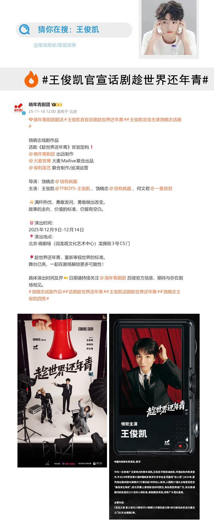 王俊凯话剧《趁世界还年青》官宣定档演出时间:12月9日-12月14日和小凯一起在话剧舞台上探寻现实的真相祝大家都能抢到票,票来票来票来