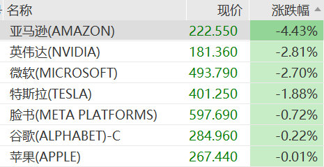 【】美东时间周二,美股三大指数集体收跌,纳指和道指跌幅均超过1%,其中道指下跌498.5点。大型科技股普跌,费城半导体指数领跌,迈威尔科技跌近6%,超威半导体跌超4%。亚马逊跌4.4%,市值一夜蒸发1103亿美元(约合人民币7839.90亿元)。微软跌2.7%,特斯拉跌1.9%。美股“七巨头”本月迄今已下跌了近5%。AI芯片龙头英伟达跌近3%,该股本月已下跌超10%,其将在周三收盘后公布的三季度业绩备受关注。消息面上,亿万富翁Peter Thiel旗下对冲基金三季度清空了全部53.7万股英伟达持仓,全球最大对冲基金桥水则在同期大砍65%的英伟达仓位,软银也披露已出售所持全部英伟达股份。