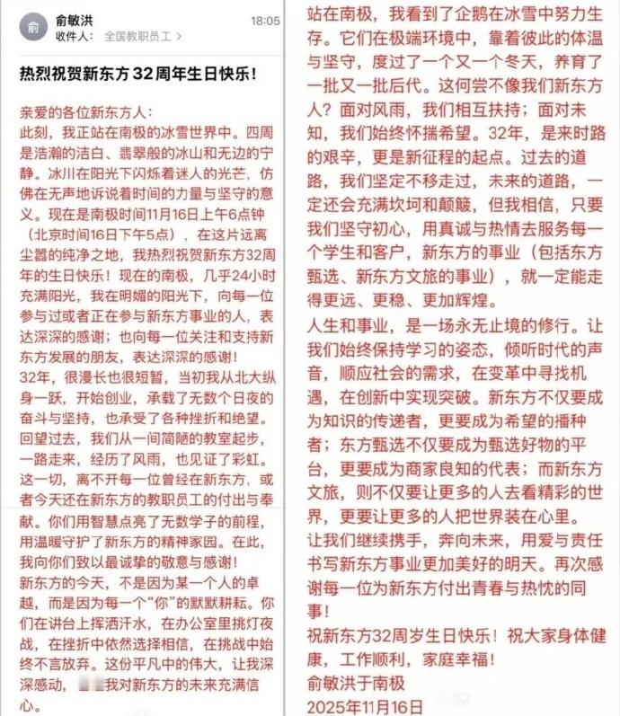 【】11月16日,新东方迎创立32周年纪念日,创始人俞敏洪在南极考察期间向全体员工发出内部信。有员工表示无法与正在旅游的老板共情,也有员工透露,纪念日当天上完课还要连夜加班做续课方案。18日一早,“新东方员工吐槽俞敏洪内部信”等话题词登上热搜。当天上午,俞敏洪在社交平台连发10条南极游视频。极目新闻记者发现,18日下午,俞敏洪在抖音账号再次发布一条视频,视频依然是其南极之旅的画面,不过其在画面中配文写道:“这次应奚老师邀请来南极,在深刻感受大自然壮美的同时,也一起探讨了未来中国孩子自然教育的前景,新东方将会成立专门的青少年探索中心,带领孩子们探索大自然,用科学的方式让孩子们理解大自然,爱上大自然,保护大自然!专门针对青少年的南极考察之旅,也有望在明年冬天开启。”俞敏洪在文中介绍的奚老师是谁?据极目新闻此前报道,奚老师全名为奚志农,是一名野生动物摄影师,也是“野性中国”工作室创始人。公开资料显示,奚志农是中国野生动物摄影师和环保主义者,“野性中国”工作室创始人,也是云南省摄影家协会副主席。奚志农曾拍摄过鲜为人知的国家一级保护动物滇金丝猴;还最早报道了藏羚羊被大肆猎杀的危急状况以及“野牦牛队”为保护藏羚羊做出的艰苦努力。他曾获英国“自然银幕电影节”TVE奖、中国摄影传媒大奖年度摄影人物等荣誉。早在2023年4月12日,奚志农就已做客东方甄选直播间,与俞敏洪分享自己的摄影经历。当晚,奚志农主编的首发新书《生命的灵动》在直播间共上架1万余册,最终全部售罄。(极目新闻)