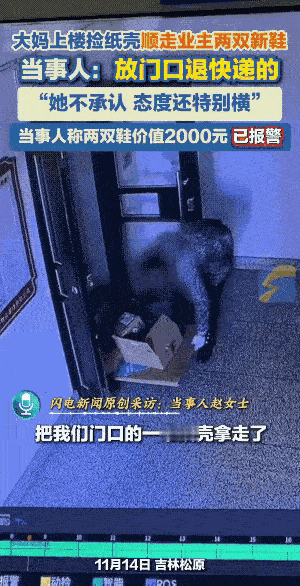 真服了这个大妈 一个大妈上楼捡纸箱子,把人家门口纸箱子拿走,还有两双新鞋,这鞋是准备退快递的。 查看监控摄像头,才发现是这个大妈拿走的,但大妈还不承认,女子己报警。 大妈也太过分了,跑到人家门口捡纸箱子,还拿人家的新鞋,这不是捡,就是偷。 大妈是穷疯了,看见什么拿什么,明的是捡破烂,实际就是小偷小摸。 做人即便身处困境,囊中羞涩,也绝不能缺失品德,即便贫穷,也要穷的有骨气,即便困苦,也要苦的光明磊落,无论境遇多么艰难,都绝对不能去做犯法的事。穷也要穷的干净,不是自己的东西,再好都不能拿。 大妈这次丢大人了,有视频作证,她的嘴再硬,也说不过视频,等候警察处理。 朋友们,你们对此事怎么看?欢迎讨论! 声明(视频来源于网络,侵权联系删除)