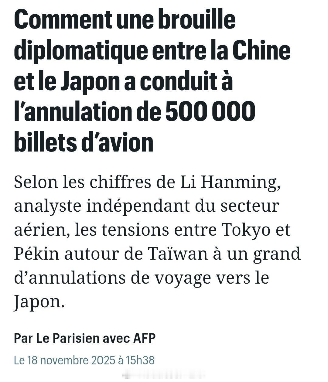 法国媒体报道了“中日之间的外交摩擦如何导致 50 万张机票被取消据独立航空业分析师李涵明的数据,由于东京与北京在台湾问题上的紧张关系,前往日本的旅行出现大量取消。因果巨大,影响同样巨大。据该行业分析师周二向法新社表示,在外交紧张背景下,中国劝阻民众赴日旅行,导致约 50 万张飞往日本的机票被取消。根据李涵明的统计,飞往日本的“有效预订”(即已订但尚未出行的机票数量)从周六的约 150 万张 ,在两天后骤降至 仅 100 万张。总共有 50 万张机票被取消,在规模上十分罕见”。