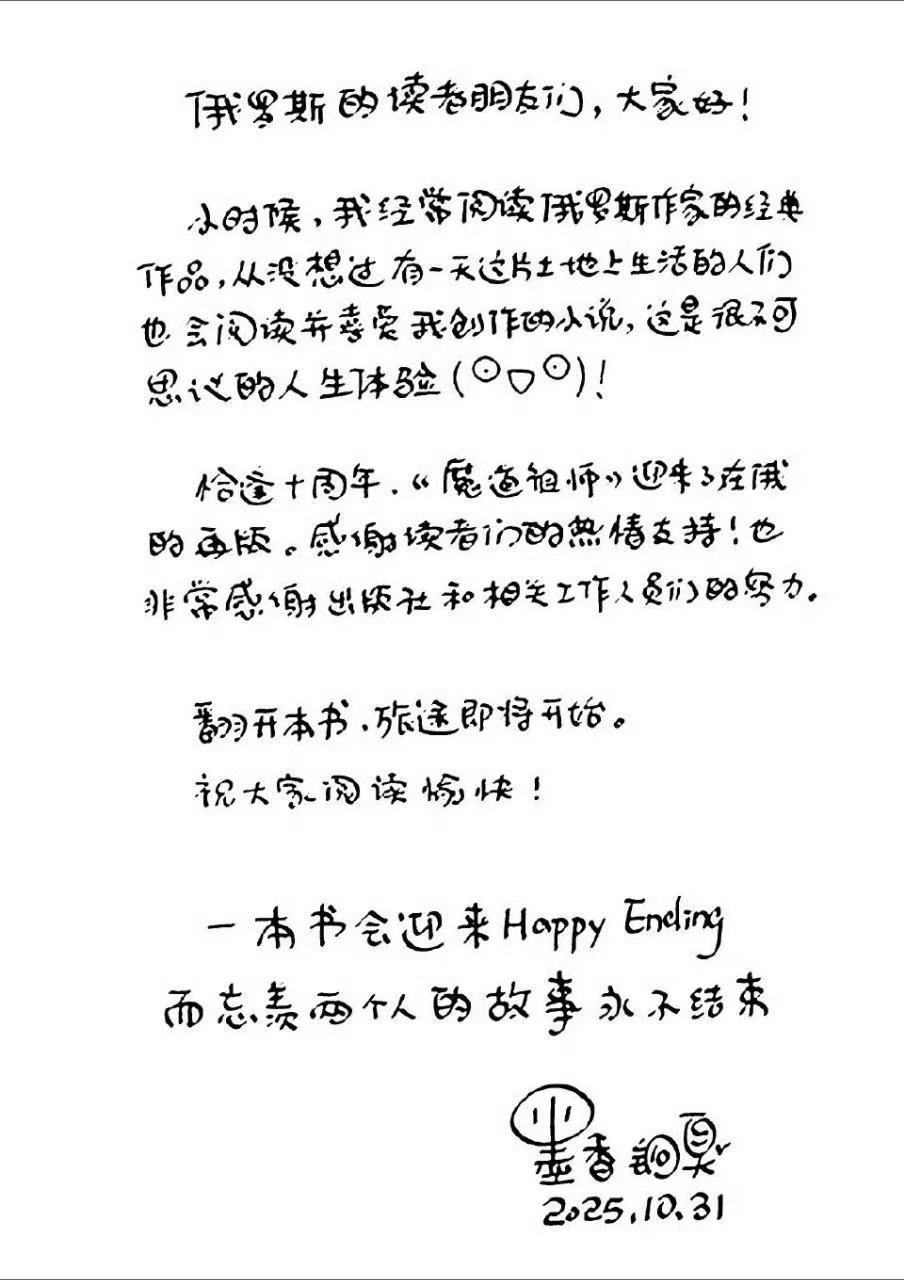 墨香铜臭十周年寄语专门给俄版写了“忘羡两个人的故事永不结束”。好感动😭,忘羡一曲远,曲终人不散。