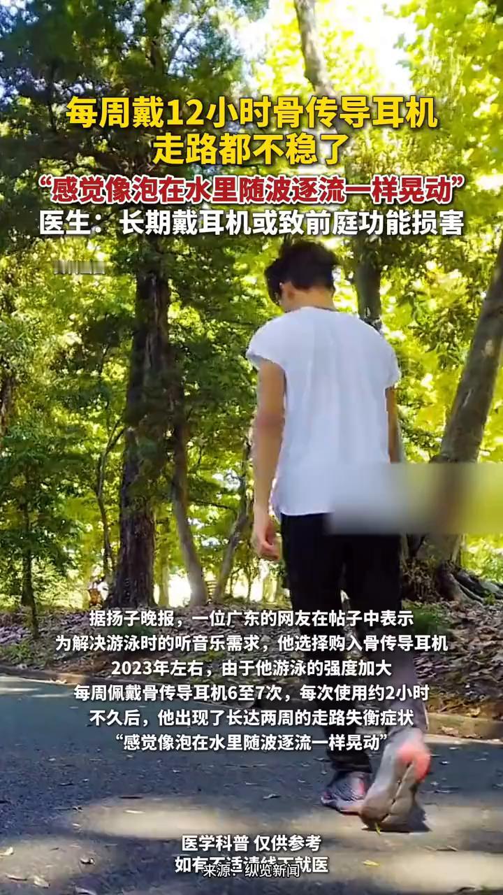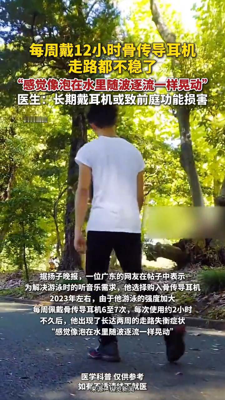 每周戴12小时骨传导耳机,走路都不稳了,感觉像泡在水里随波逐流一样晃动。医生:长期戴耳机或致前庭功能损害。 据扬子晚报,一位广东的网友在帖子中表示,为解决游泳时的听音乐需求,他选择购入骨传导耳机。2023年左右,由于他游泳的强度加大,每周佩戴骨传导耳机6至7次,每次使用约2小时。不久后,他出现了长达两周的走路失衡症状。 起初他误以为是游泳姿势不当所致,直到在社交平台上看到相关网友的讨论,才将怀疑的目光投向骨传导耳机。该网友称,此后虽然仍在使用骨传导耳机,但是使用频率降低后,失衡症状再也没有出现。 南京市中西医结合医院耳鼻喉科副主任医师朱晓燕告诉记者,不排除上述事件中的网友有前庭敏感的可能。"对于前庭敏感或者有其它内耳疾病人群,不管是入耳式、头戴式还是骨传导耳机,长时间佩戴都有可能导致头晕、恶心,甚至导致听力下降以及前庭功能的进一步损害"。如有不适请线下就医。