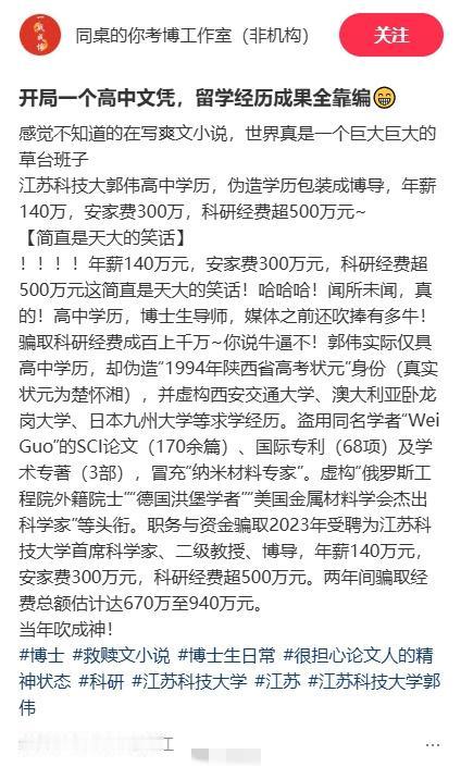 真魔幻,以为江苏科技大学请一个高中生当省首席科学家的事太炸裂了,会不会是假的?结果今天学校发通告了,学术不端已经报案了…他是怎么一步步做到博士生导师的地位,而且那么多年没被发现,还准备申报院士…不知道的还以为在写爽文小说,问题到底出在哪里?难道世界真是一个巨大巨大的草台班子?