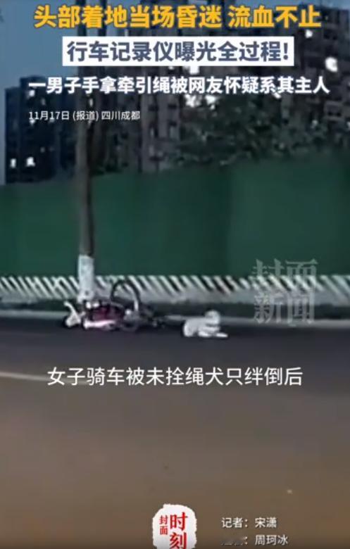 成都一女孩子骑车突然被路边的一条宠物犬绊倒,导致头部着地血流不止昏迷不醒。附近车辆拍到疑似狗主人得人拿着牵引绳,在追赶肇事逃逸的拉布拉多犬。目前为止肇事逃逸犬和主人都未找到,受伤的女孩子住进了icu准备动手术 11月15号晚上,成都新都区东骏湖景湾附近的马路上,刚从朋友家出来的蒲先生正准备开车回家,眼角余光突然瞥见对面马路躺着个人,旁边还倒着一辆自行车。   他赶紧走过去,借着路边的灯光看清是个年轻女孩,脑袋下面已经积了一摊血,人昏迷着没一点反应,偶尔还会抽搐一下。   周围很快聚了几个路人,有人蹲下来试探女孩的鼻息,有人急着掏手机打120。   旁边一位大爷说,刚才亲眼看见女孩是被一条突然窜出来的狗绊倒的,大家又赶紧拨打了110。   蒲先生这才想起,自己的车一直停在对面,行车记录仪应该开着,说不定拍下了全过程。   他怕现场没监控说不清楚,就守在旁边等警察来,打算把视频交给警方。   蒲先生提供的行车记录仪影像,完整还原了那惊险的几分钟。   画面里,年轻女孩稳稳地骑着自行车向前,没任何多余动作,就在这时,路边绿化带里猛地窜出一条白色宠物狗,直直冲向车轮下方。   自行车瞬间失去平衡,女孩整个人被甩向空中,又重重砸在路面上,因为没戴头盔,头部和地面的撞击声隔着视频都让人揪心,她落地后就再没动弹过。   几乎是狗窜出的同一时间,镜头里出现个中年男人,手上明明捏着牵引绳,却没系在狗身上。   他见状立刻追向跑远的狗,脚步匆忙,却自始至终没朝倒在地上的女孩投去哪怕一个眼神。   几分钟后,急救车的鸣笛声由远及近,医护人员快速下车,给女孩做了紧急处理,随后用担架小心翼翼地将她抬上车,疾驰着送往医院。   现场等待的蒲先生,第一时间把存好的视频交给了随后赶到的民警,为调查保留了关键依据。   之后,蒲先生从女孩的朋友那里得到了个坏消息,女孩被直接送进了重症监护室,必须进行开颅手术,好在经过初步救治,医生说暂时没有生命危险。   可让人费解的是,截至11月17号,视频里那个持牵引绳的男人始终没现身,对方就像凭空消失了一样。   这事传开后,不少人都觉得窝火,女孩好好骑车没招谁惹谁,就因为一条没拴绳的狗,平白遭了这么大罪,躺在医院里受苦。   而最让人不舒服的,是那个疑似狗主人的男人,手里明明有牵引绳,却没给狗拴上,出事后不想着救人,先去追狗,之后干脆不见踪影。   这种事其实不算少见,街上经常能看到遛狗不拴绳的人,要是狗跑丢了或者被车碰了,主人比谁都着急,可一旦狗伤了人,转身就能躲得无影无踪。   蒲先生把视频发到网上后,有网友翻出之前的类似案例,常州有个阿姨被没拴绳的大狗吓到摔倒,腰椎骨折成了九级伤残,最后狗主人赔了二十八万。   淮安一个四岁的小孩,被没拴绳的金毛撞倒后颅内出血,至今还在做康复治疗。   这些案例里的受害者,都是平白无故被卷进麻烦里,而根源全是狗主人的一时疏忽,甚至是明知故犯。   现在警方还在追查那个狗主人的下落,女孩还在医院里等着康复。   蒲先生每次想起当晚的场景,都忍不住叹气,他说要是当时狗拴着绳,要是女孩戴了头盔,或许结果就不一样了。   可世上没有回头路,对那个女孩来说,这场无妄之灾留下的伤痛,可能要很久才能平复。   而对那个躲起来的狗主人来说,不管躲多久,该负的责任终究躲不掉。   街头巷尾的宠物越来越多,带来陪伴的同时,也该带来对应的责任。   一条牵引绳拴住的不只是狗,更是对他人安全的保障,也是主人的一份担当,没有人该为别人的疏忽付出健康的代价。