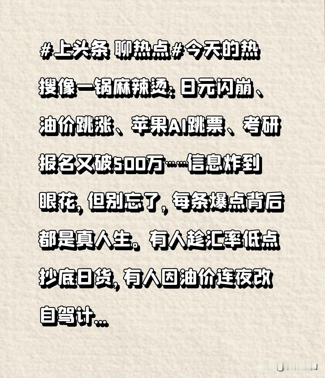 今天的热搜像一锅麻辣烫:日元闪崩、油价跳涨、苹果AI跳票、考研报名又破500万……信息炸到眼花,但别忘了,每条爆点背后都是真人生。有人趁汇率低点抄底日货,有人因油价连夜改自驾计划,有人为AI卡顿放弃换新机,还有人在图书馆通宵抢座。热点不是热闹,是信号:世界在变,钱包、时间、情绪都得重新算价。别只当吃瓜群众,把每一条热搜都当成一次小考,练判断、练行动,才能在下一波浪潮来时,不是被卷走,而是站上浪头。