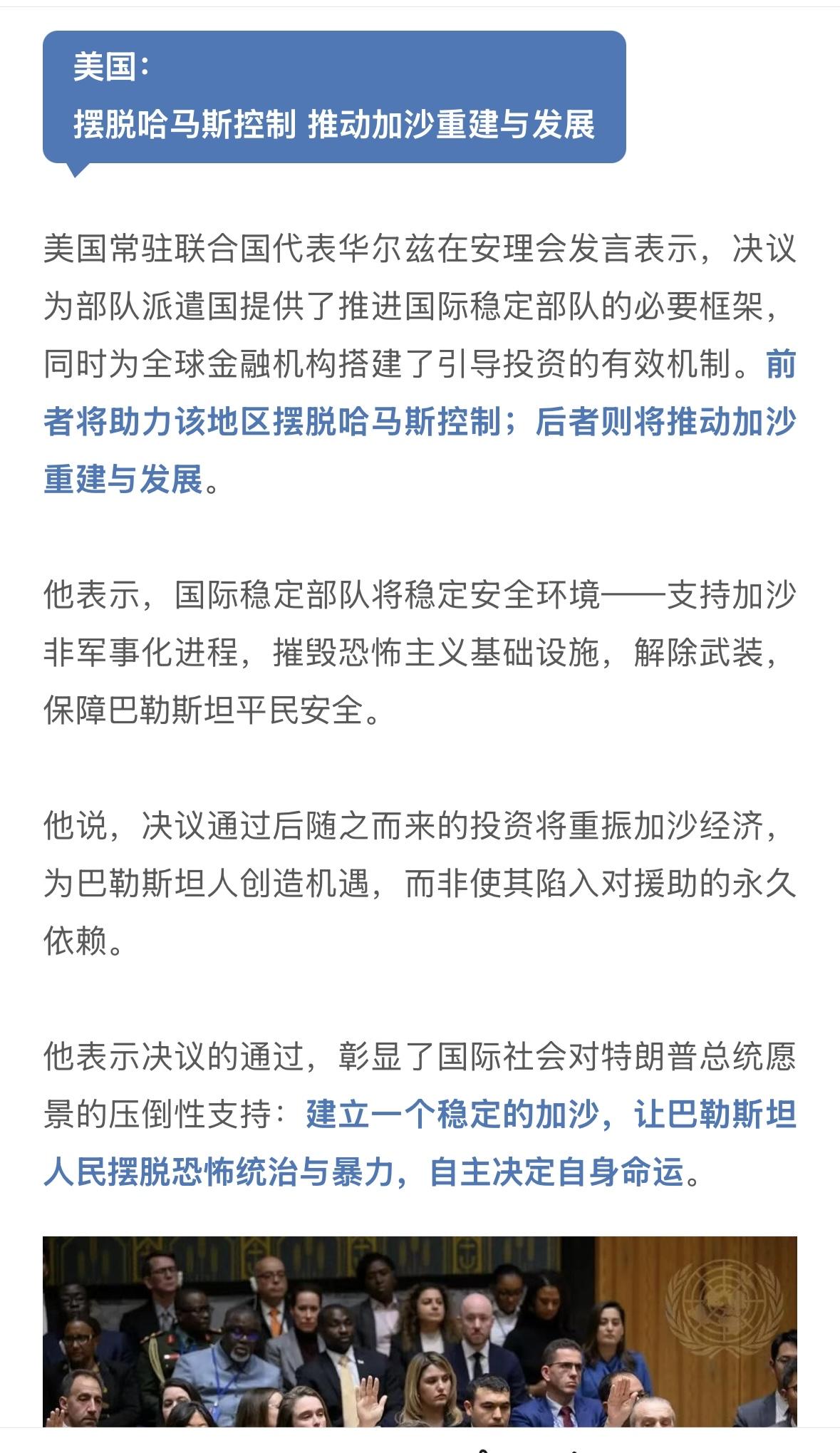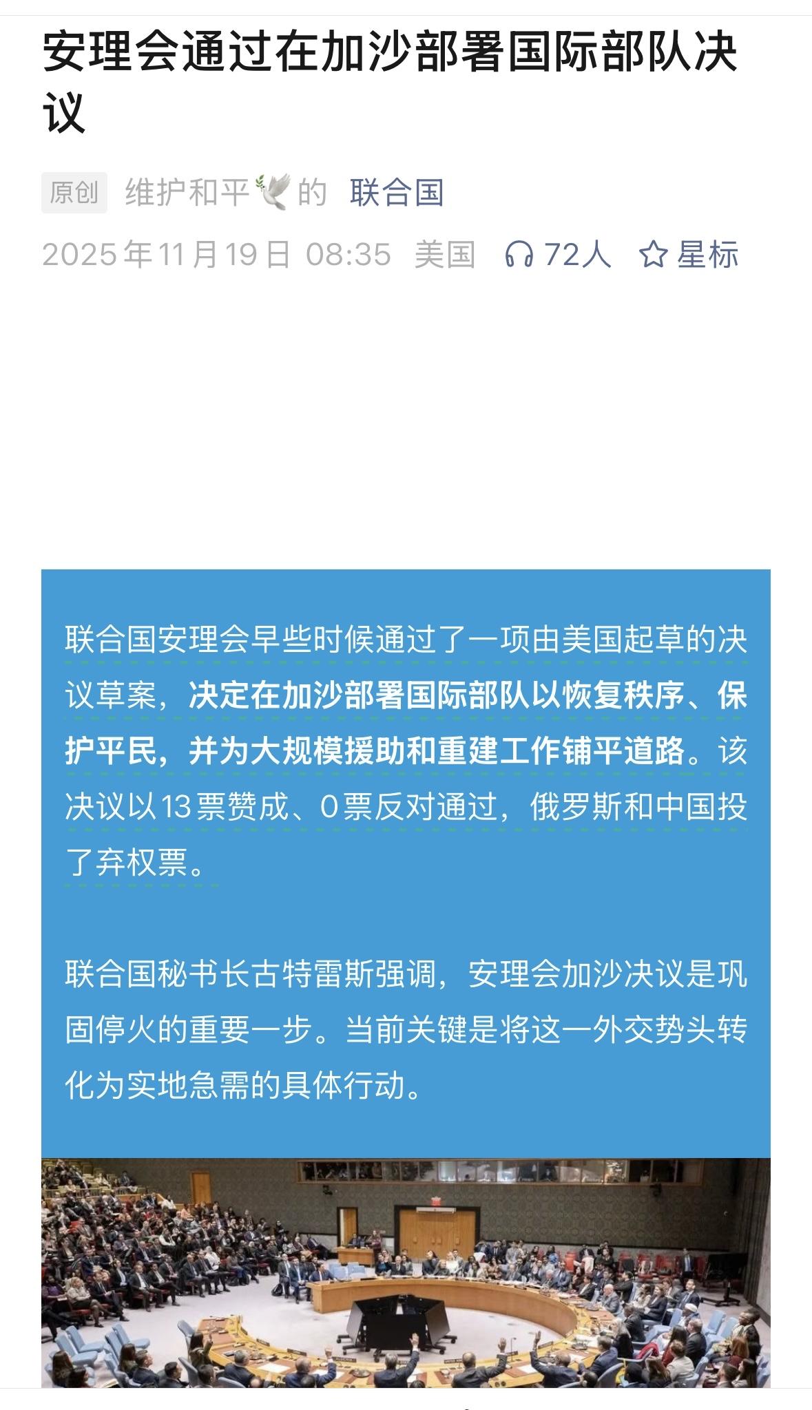 联合国将在加沙部署维和部队,成立机构接管加沙事务,希望能带来加沙和平,哈马斯彻底退出历史舞台,中国认为这个方案不够清晰,很多关键问题没有理清楚,担心盲目推出会出现意外,所以透了弃权票,没有提出反对意见。俄罗斯和中国的意见差不多,也投了弃权票。方案得以顺利通过!在联合国框架内解决问题,这个案例,不错。,#特朗普版加沙和平计划或将敲定# #加沙或迎来真正和平#