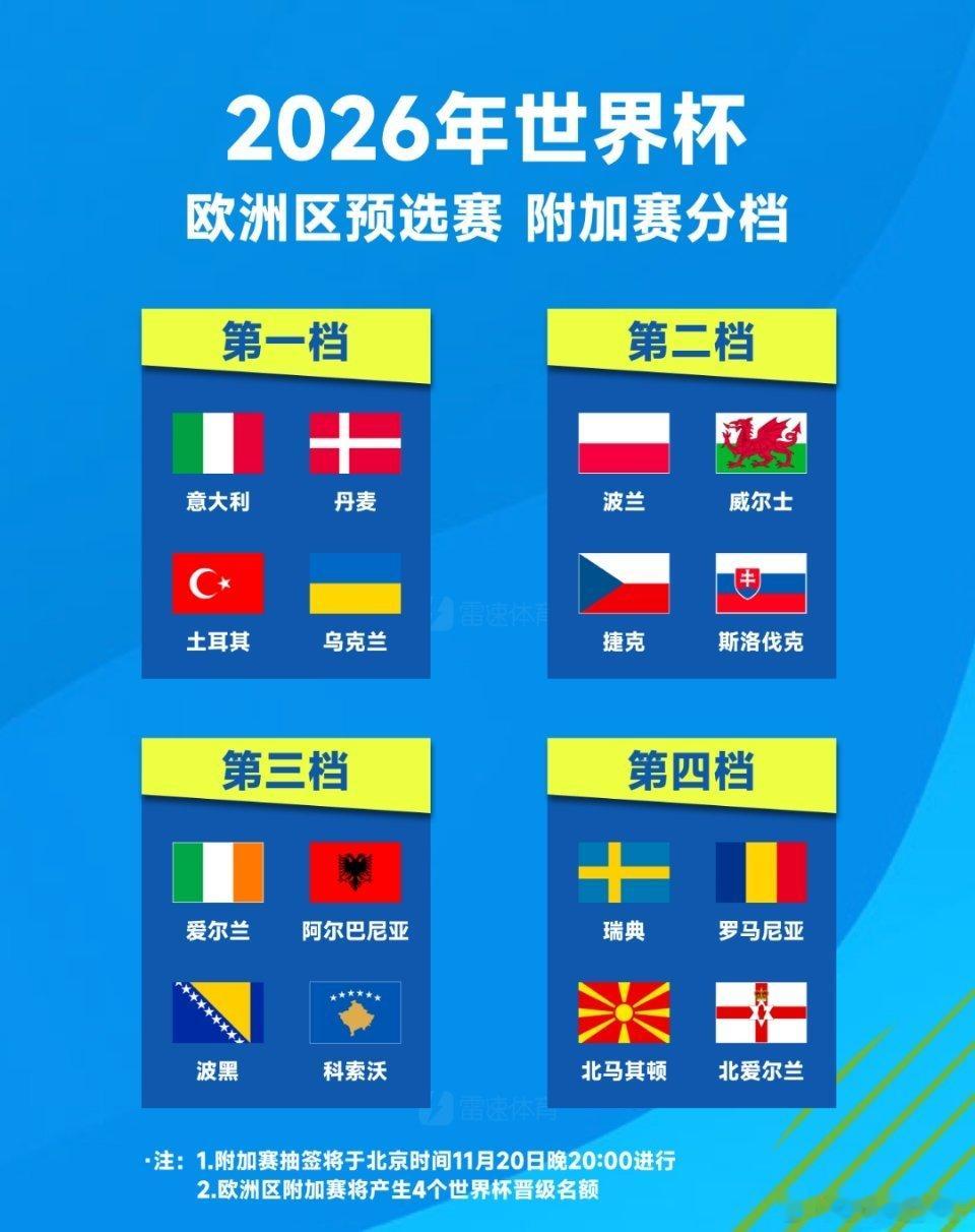 世欧预小组赛收官战比赛全部结束,12个小组第一的球队获得直通名额。与此同时,欧洲区16支参加附加赛的球队也浮出水面。16支附加赛球队第一档:意大利、丹麦、土耳其、乌克兰第二档:波兰、威尔士、捷克、斯洛伐克第三档:爱尔兰、阿尔巴尼亚、波黑、科索沃第四档:瑞典、罗马尼亚、北马其顿、北爱尔兰附加赛球队构成世欧预各小组第二:意大利、丹麦、土耳其、乌克兰、波兰、威尔士、捷克、斯洛伐克、爱尔兰、阿尔巴尼亚、波黑、科索沃欧国联小组第一:瑞典、罗马尼亚、北马其顿、北爱尔兰