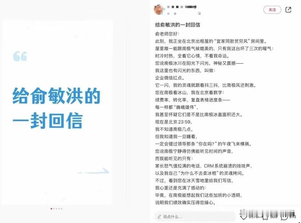俞老师这次翻车并不是因为他去了一趟南极!如果换人,是董宇辉去南极呢,我想情况肯定不一样的。 这是为什么呢? 我认为问题出在以下两个方面: 第一、俞老师的价值观与时俱进不够,还停留在10年前,10多年前你卖情怀可以,当下是什么时代了,是先富带后富,国家鼓励的是公平,带动大家都富起来,而俞老师还是一副资本家的姿态,靠劳动者的付出,而劳动者没有获得幸福感,这就是老俞的失败之处,大家不关心你在南极快乐,而是你带给员工和社会的价值是什么? 第二、新一代的年轻人更加重视真正的获得感,而不是虚拟的诗与远方,年轻人不吃这一套了,他们需要的是新的商业逻辑,创业制富,从新东方出来的董宇辉就是真正的践行者,他们忍不了不公平的职场,不像我们70后,80后一代都是老实的忍,吃亏就吃亏,这也是那个时代一些老板那么容易成功的原因之一,这些员工默默付出,不求回报,而老板们的吃相从来不收敛。 俞老板如果想得到大家的认可与支持,就是要更多的关注社会和劳动者的发展,共享发展红利才是真的实现个人价值的方向。否则将被所有人抛弃。