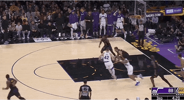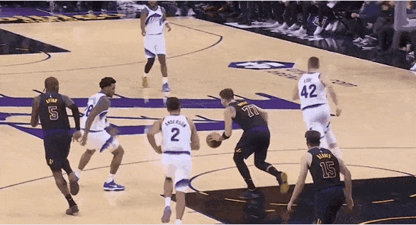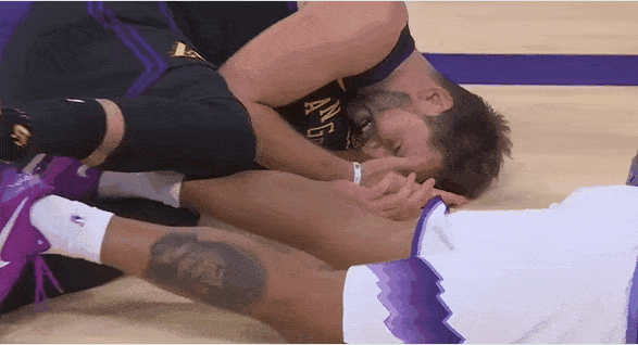 东契奇后场推进时遭三人围抢,被李凯尔撞到眼角痛苦倒地