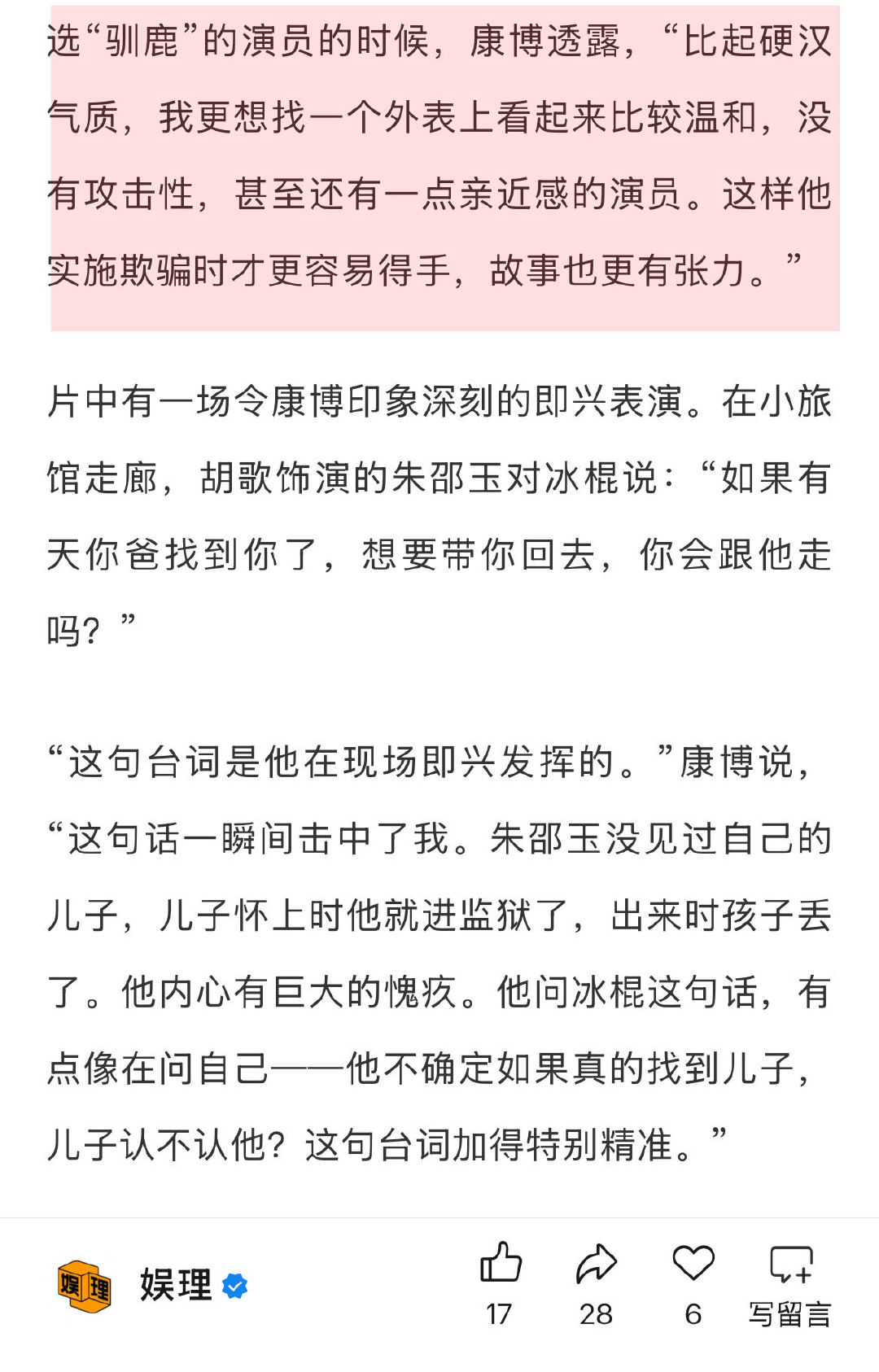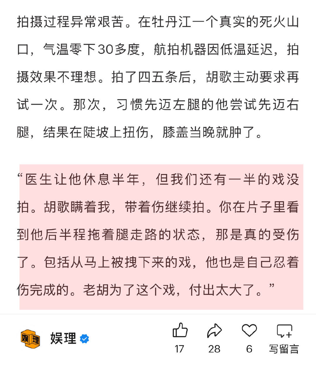 《三滴血》导演康博谈选角胡歌:“比起硬汉气质,我更想找一个外表上看起来比较温和,没有攻击性,甚至还有一点亲近感的演员。这样他实施欺骗时才更容易得手,故事也更有张力。”在牡丹江的死火山口拍摄时,胡歌意外扭伤,“医生让他休息半年,但我们还有一半的戏没拍。胡歌瞒着我,带着伤继续拍。你在片子里看到他后半程拖着腿走路的状态,那是真的受伤了…”↓