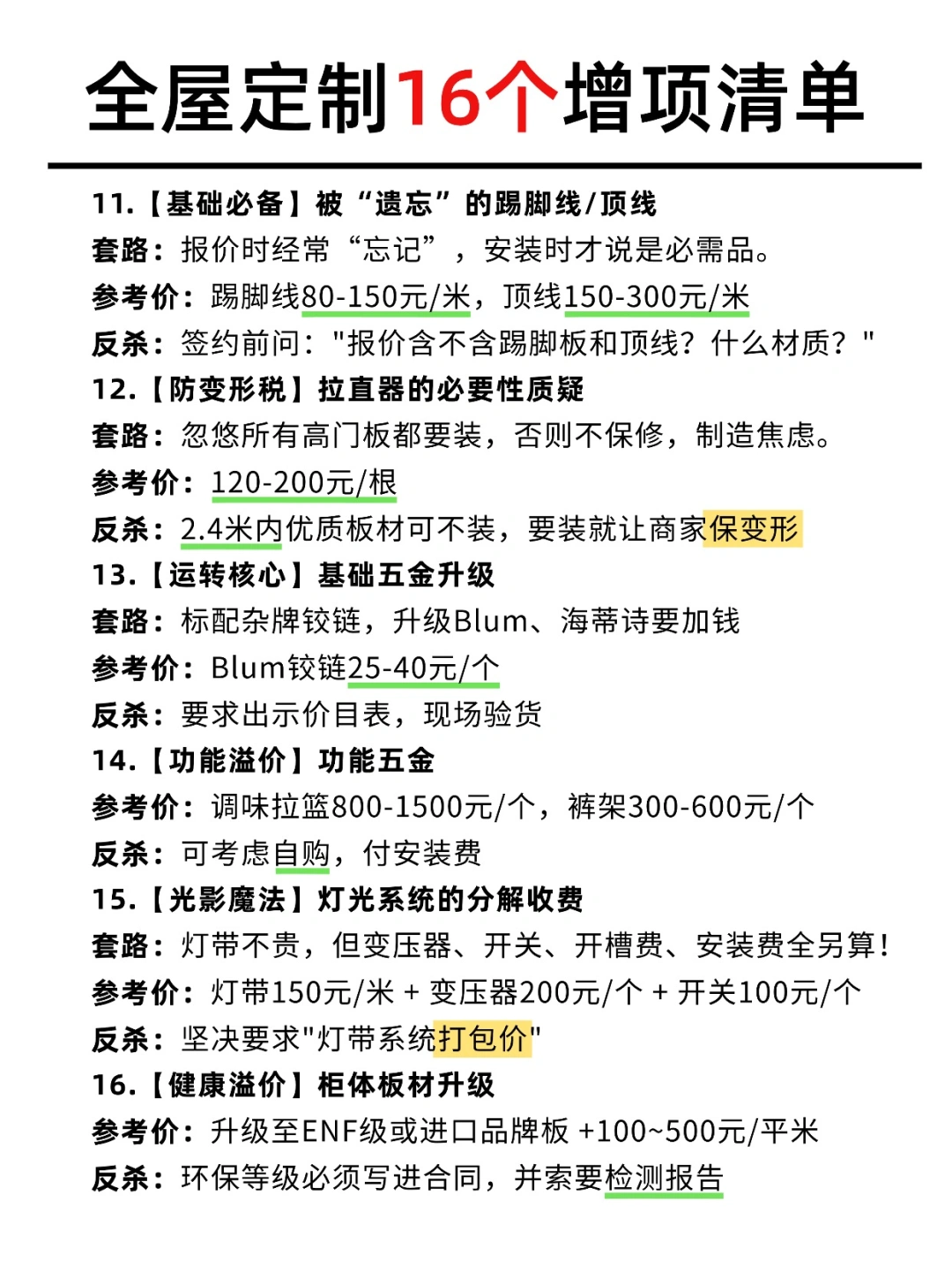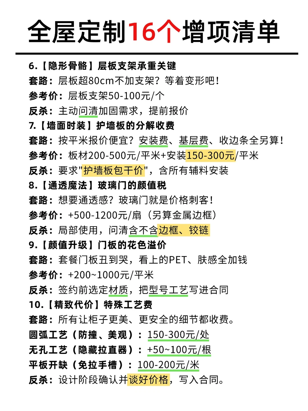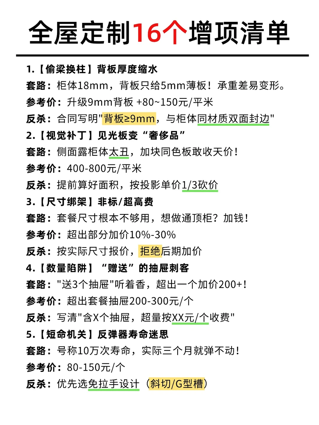 真的会谢!全屋定制的坑多到能写本书! 看到XXX元/平就冲动下单? 等签合同时才发现, 增项费用比主材本身还贵! 我扒光全网攻略+亲身踩坑, 吐血整理出这份《全屋定制增项刺客大全》 准备定制的宝子们,赶紧收藏!📖 💸【结构骨架刺客】 1️⃣ 背板厚度缩水 柜体18mm,背板只给5mm薄板 反杀:合同写明"背板≥9mm同材质" 2️⃣ 见光板变奢侈品 侧面遮丑板敢收500+/平 反杀:按投影单价1/3砍价 3️⃣ 非标/超高费 想做通顶柜?加钱! 反杀:按实际尺寸报价 💸【功能使用刺客】 4️⃣ 抽屉刺客 "送3个抽屉"超出一个加价200+ 反杀:写清数量+单价 5️⃣ 反弹器寿命陷阱 三个月就弹不动! 反杀:选免拉手设计 6️⃣ 层板支架 超80cm必须加装 反杀:提前确认报价 💸【颜值工艺刺客】 7️⃣ 护墙板分解收费 板材+安装+收边条全分开算 反杀:要求包干价 8️⃣ 玻璃门颜值税 一扇加价500-1200 反杀:问清含不含边框 9️⃣ 门板升级 看上的颜色全要加钱 反杀:签约前选定写进合同 💸【细节收边刺客】 🔟 踢脚线/顶线 报价时"忘记"包含 反杀:提前确认材质价格 💸【防变形刺客】 1️⃣1️⃣ 拉直器焦虑税 不是所有高门板都需要 反杀:2.4米内优质板材可不装 💸【五金灯光刺客】 1️⃣2️⃣ 基础五金升级 换Blum铰链+25-40/个 反杀:现场验货 1️⃣3️⃣ 功能五金 拉篮/裤架/调味架 反杀:可自购+付安装费 1️⃣4️⃣ 灯光系统 灯带不贵,变压器/开关另算 反杀:要求打包价 💸【环保基材刺客】 1️⃣5️⃣ 板材升级 ENF级/进口板+100-500/平 反杀:索要检测报告 拿着这份清单去谈价 商家直接说我太专业 立马给了最实在的报价😂