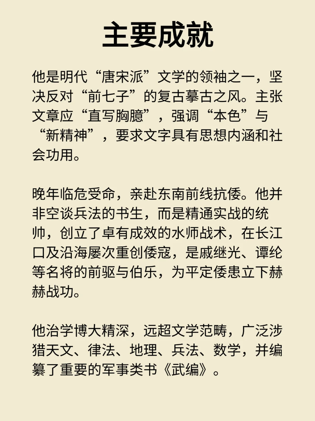 他是明代“唐宋派”文学的领袖之一,坚决反对“前七子”的复古摹古之风。主张文章应“直写胸臆”,强调“本色”与“新精神”,要求文字具有思想内涵和社会功用。