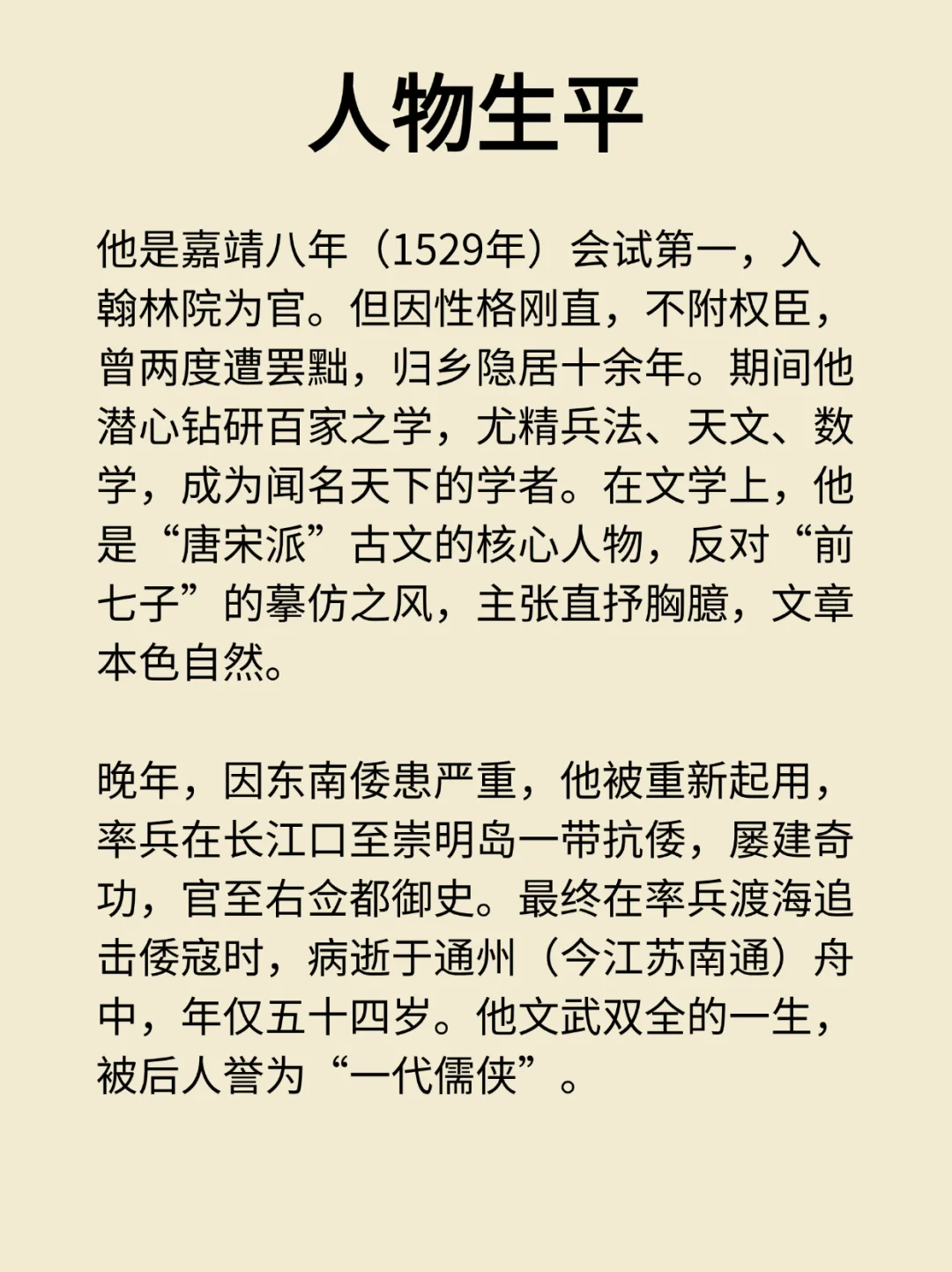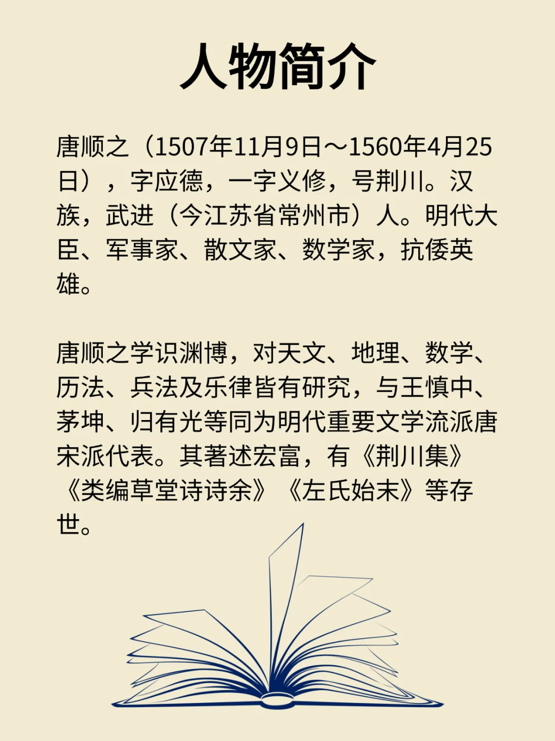[拔草R]唐顺之学识渊博,对天文、地理、数学、历法、兵法及乐律皆有研究,与王慎中、茅坤、归有光等同为明代重要文学流派唐宋派代表。其著述宏富,有《荆川集》《类编草堂诗诗余》《左氏始末》等存世。