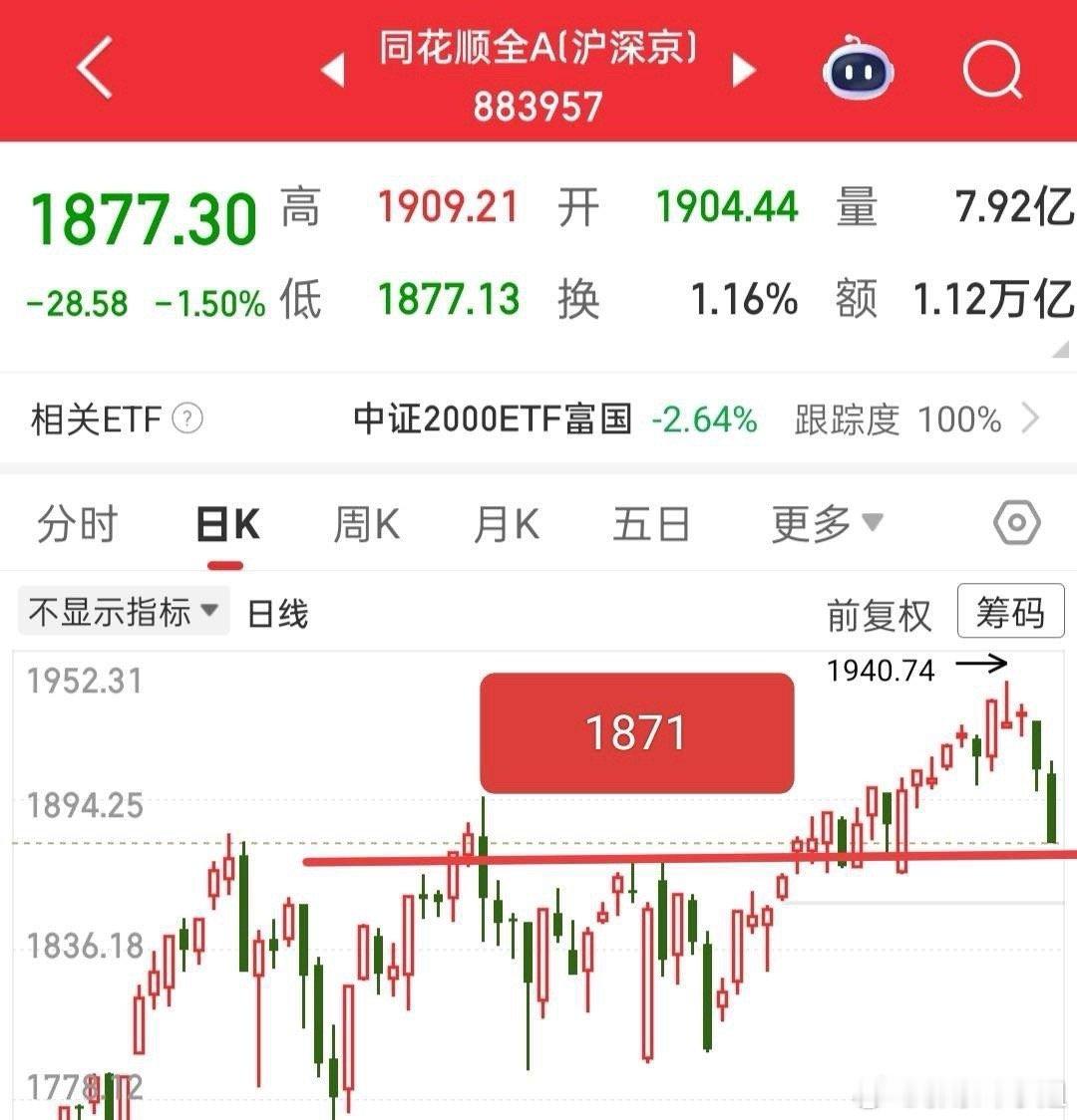 这种行情没法说,多点耐心,虽然不建议割肉,目前上涨家数已经800多家,对于这种冰点,就看全A指数1871点。这行情基本就是开盘有利就跑,有人赚一块嫌少没跑,然后硬生生亏了一百!如果跑了,是不是就相当于赚了101呢?那么我们就等待吧,目前来看下午全A还要继续下探,不能企稳是不可以入场的,下方支撑我们就看到1871点!是否能撑住!!如果企稳就可以加天山铝业