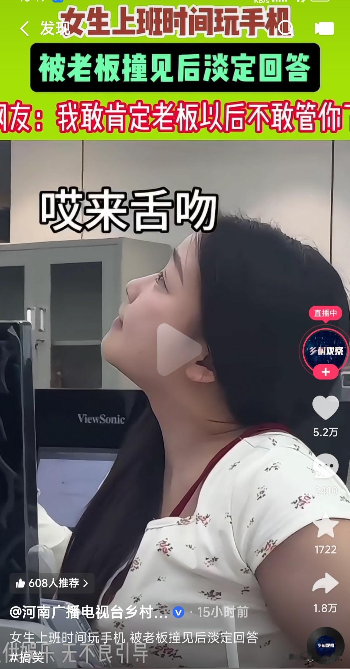 女子上班时间玩手机被老板撞见后淡定回答,上班时间不玩手机玩什么?难不成和你耍朋友吗?说话之间就对老板又是吐舌头,又是挤眉弄眼,接下来的操作更是气的老板转身就走,她居然对老板说过去和她舌吻,又让他赶紧离婚,她等着老板,老板气的走后她又骂人家有病,这到底是老板有病还是这女员工有病?现实生活中真有如此蛮不讲理的女员工吗?为什么员工比老板还横呢?