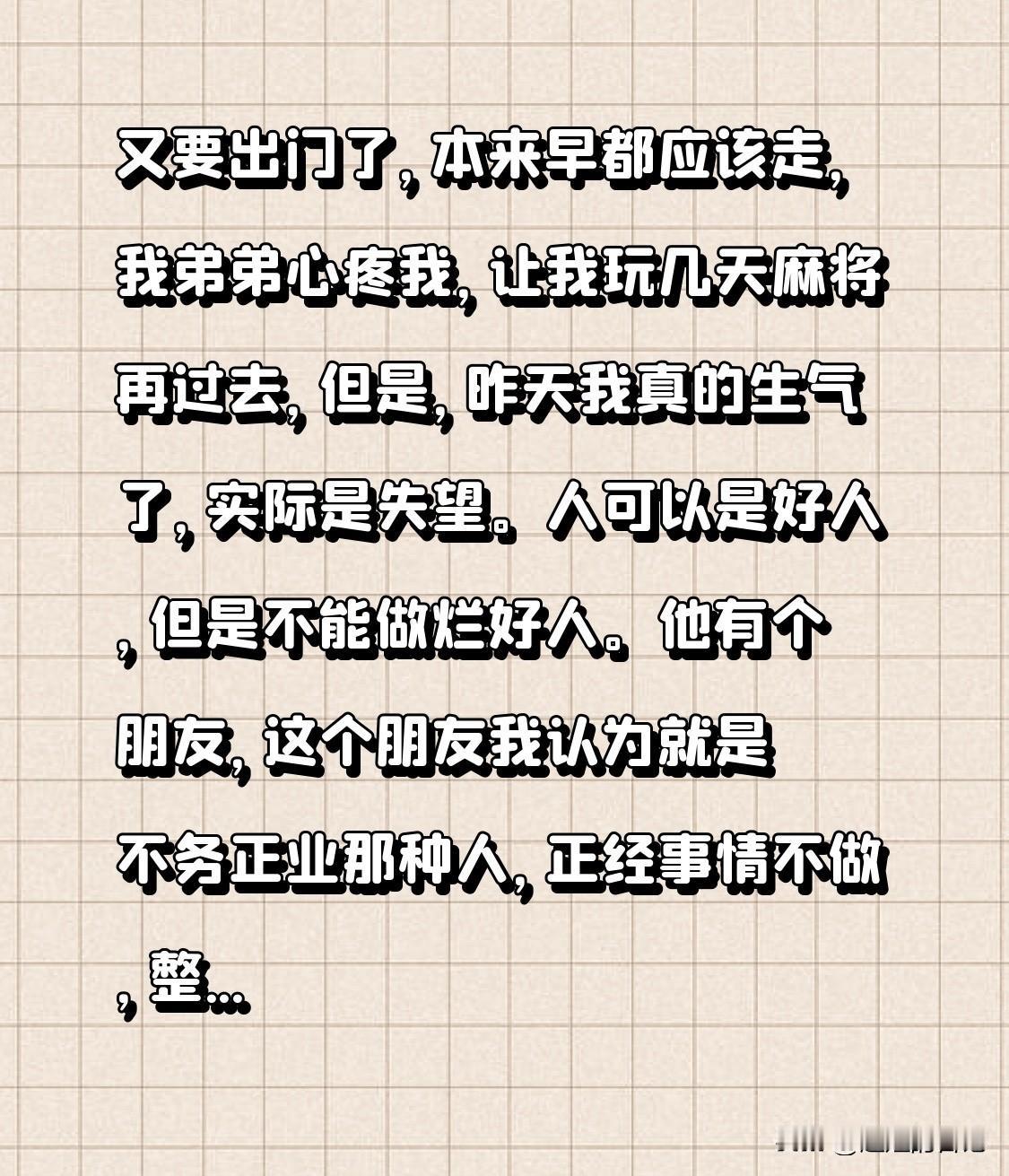 又要出门了,本来早都应该走,我弟弟心疼我,让我玩几天麻将再过去,但是,昨天我真的生气了,实际是失望。 人可以是好人,但是不能做烂好人。 他有个朋友,这个朋友我认为就是不务正业那种人,正经事情不做,整天游手好闲,吃喝玩乐,连老婆都能打跑的人,大家想想,得多差劲,这样的人跟他是朋友,尽管是从小到大的邻居,我也希望他们永远不要来往。 主要问题是,这个人经常没钱就跟他要,原来要就给,现在他自己都这样了,哪来钱给他,但是他还想给,也真给,这就让我很生气了。 前天晚上要钱,而且是那种特不要脸的要,直接说没钱了,给我转点。他也喝多了,就没搭理他。昨天晚上,又跟他要钱,他居然给我几百现金,让我给他转到微信上,他要转给他,因为那个人在外面喝酒没钱结帐了。 我很生气,没给他转微信,而且我说了他几句。我说,你自己老婆都不心疼,你心疼一个外人,有这个钱,你不想着给我买件衣服,你给个混子买单。 我说完这话,他居然吼了我一句! 说真的,我的心瞬间凉了,再也没跟他说一句话,直接拿起手机买票,走人了。 为了值得的人付出多少我都愿意,如果你心里只有别人,对别人可以舍弃自己家人的利益,这样的人就没救了。 我承认他念及旧情,但是,如果这个人是因为喝酒没钱买单,真的值的你付出同情么?有几百块钱给父母买点东西不好么?给自己老婆买件衣服不好么。 这就是等于损害我的利益去做个烂好人,分不清远近,里外的一个人,被别人当大傻子的一个人。 我就曾经问过他,你欠他钱么?我真以为他欠他钱,结果是,那个人还欠他3万,这3万是那个人跟他借,他一次性借给他的,平时零散给的都没计算。 以后他爱给谁钱都跟我没关系了!
