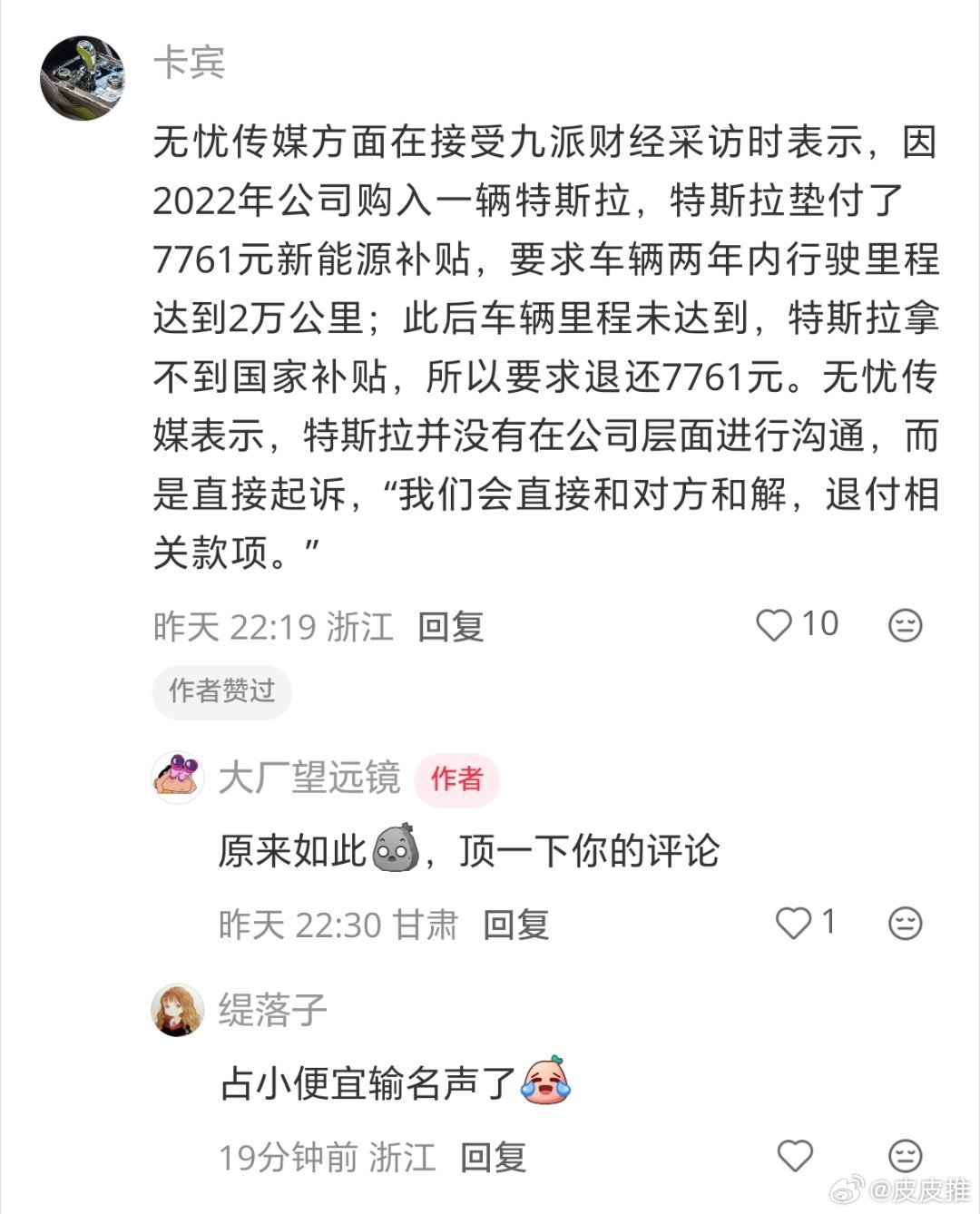 据界面新闻,特斯拉起诉无忧传媒,要求退还7761元新能源补贴。网友:占小便宜输名声了!