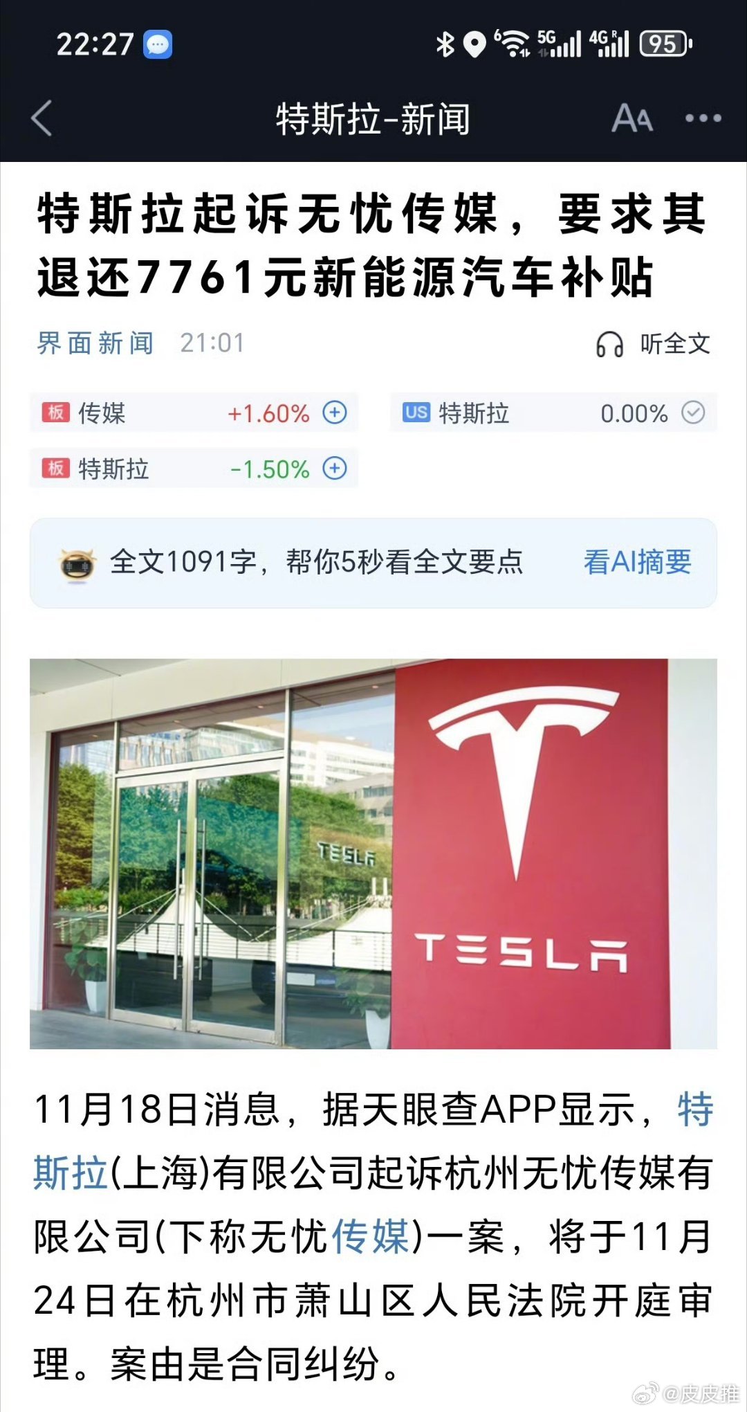 据界面新闻,特斯拉起诉无忧传媒,要求退还7761元新能源补贴。网友:占小便宜输名