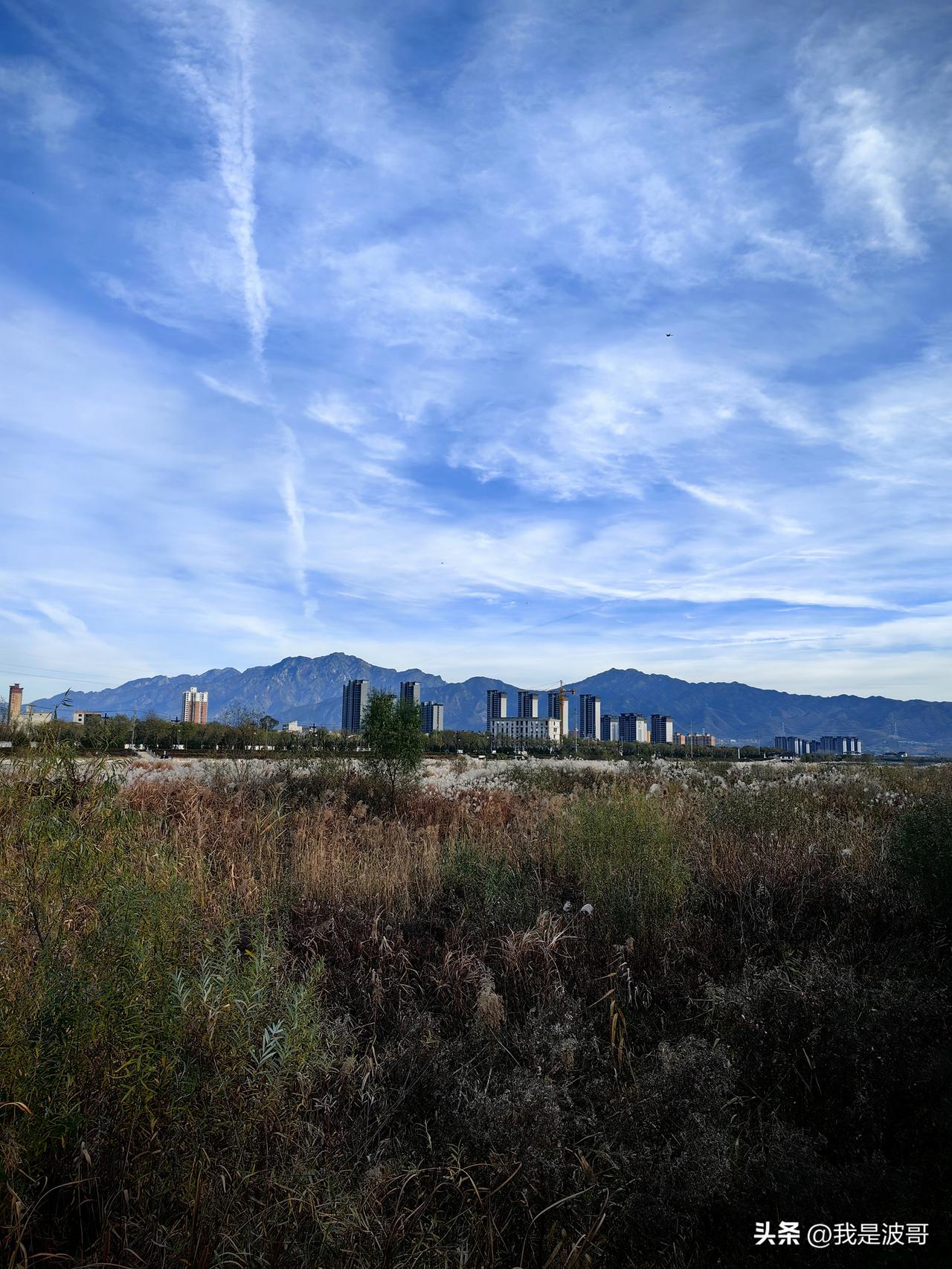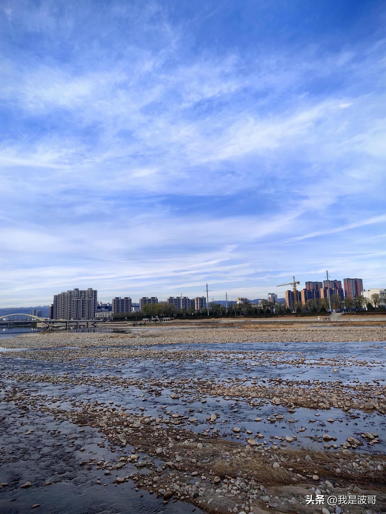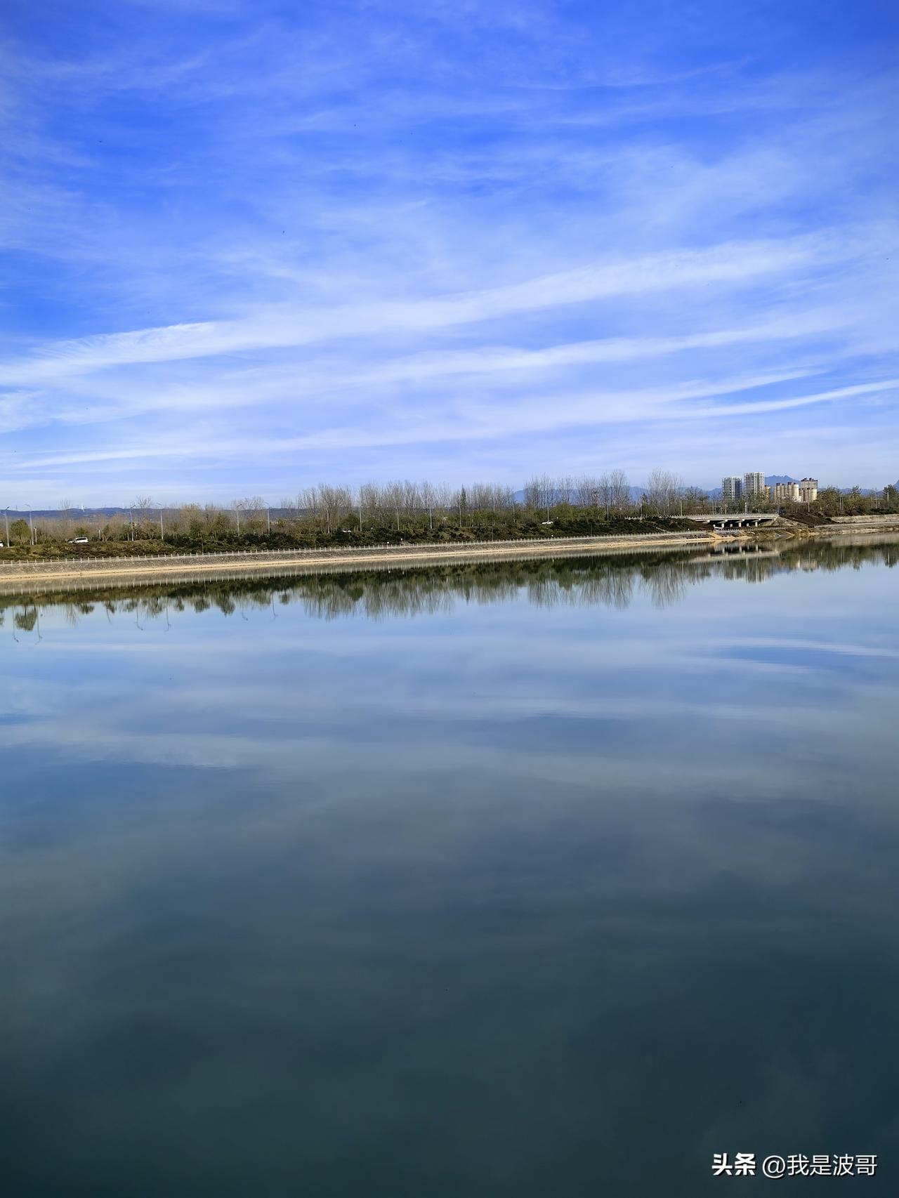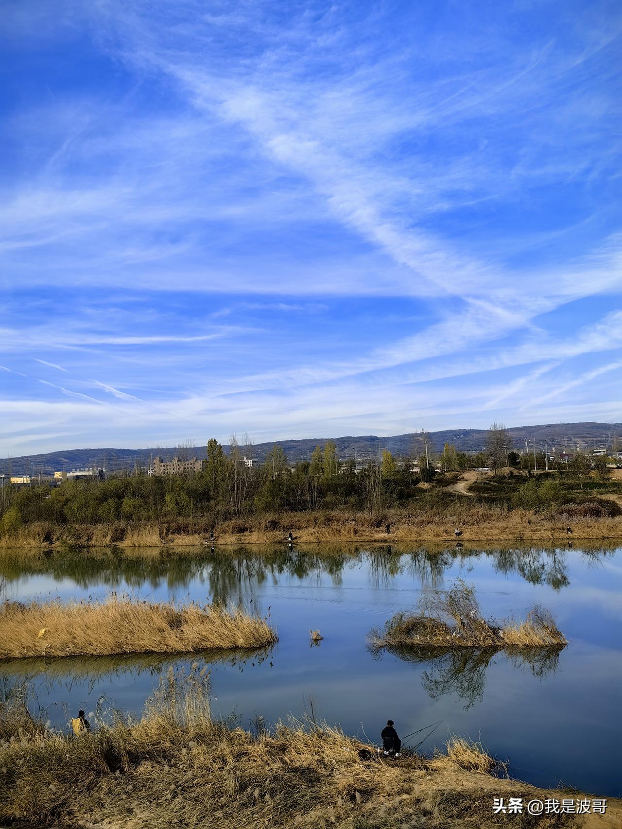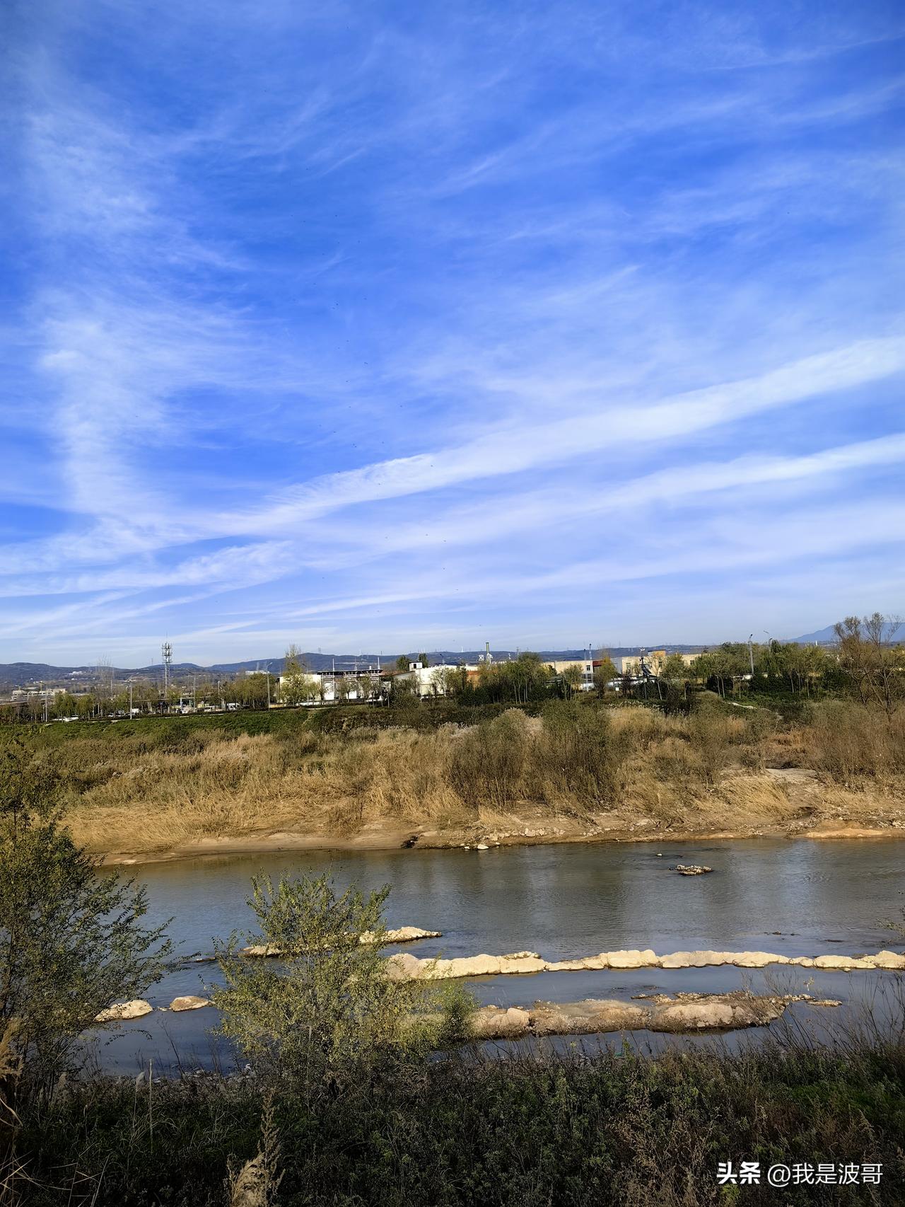 白鹿塬底,滋水河畔,夕阳西下,蓝天白云