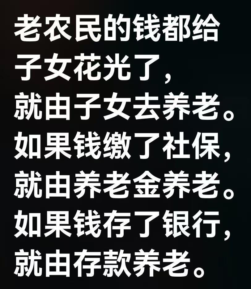 农民朋友们:除缴纳养老保险外,要让儿女们来决定你是否能过上幸福的晚年,因你养他小,他养你老,养儿防老天经地义,否则你只是养了一堆造粪的机器,天上没有掉馅饼的,不能依赖别人来养你老,无儿无女由政府民政部门救助。