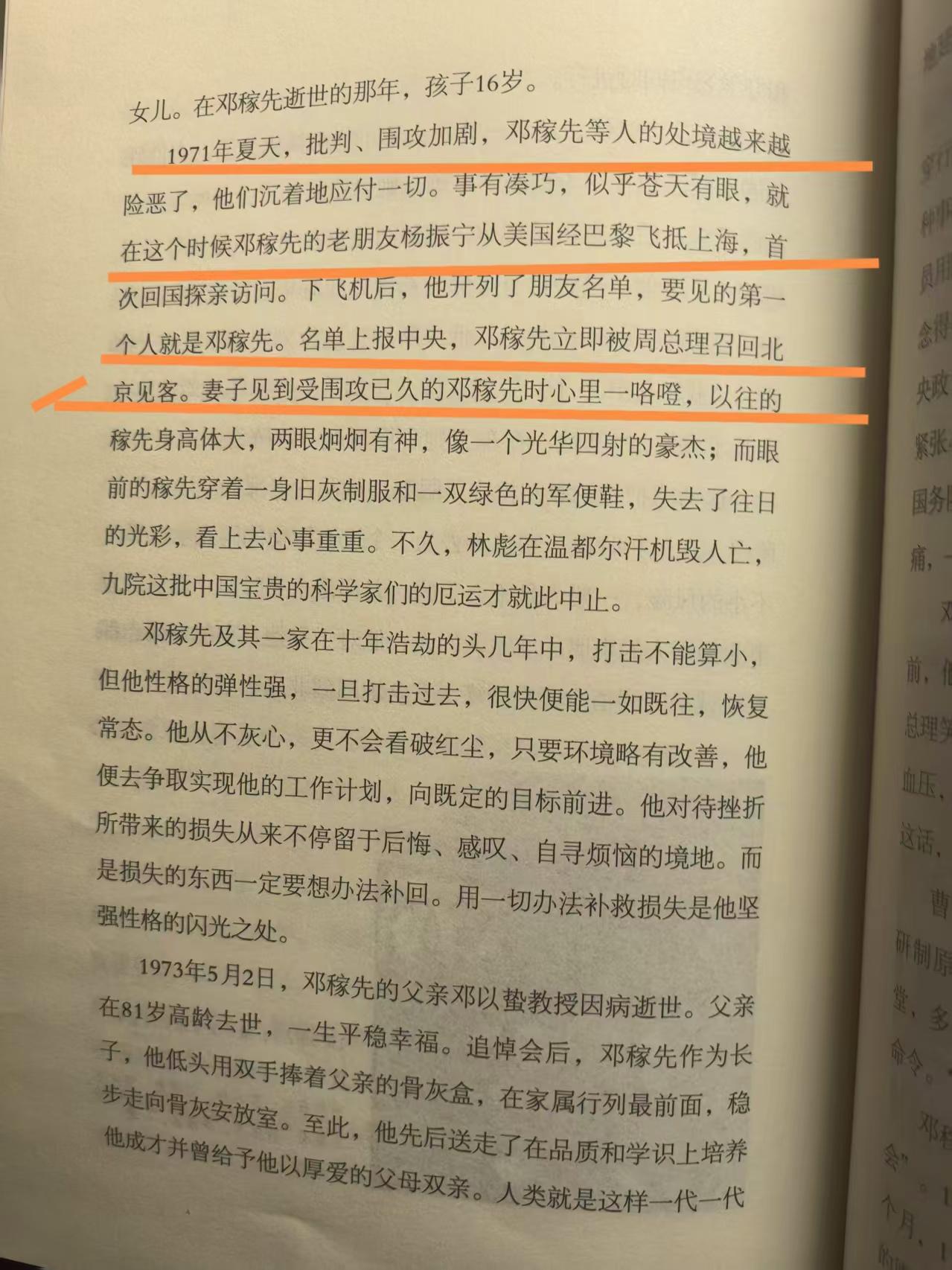 没想到!杨振宁居然是邓稼先的救命恩人。 晚上住九院的招待所,闲来无事翻看了一下床头摆放的邓稼先夫人许鹿希写的《邓稼先传》,才知道两人这一段渊源。 有人说杨不如邓,没有第一时间回到新中国,纯属是求全责备。以杨的家庭和婚姻背景,如果杨当时在国内,在特殊年代恐怕只能是老舍、叶企孙、束星北的结局,不但自身难保,更救不了邓稼先。
