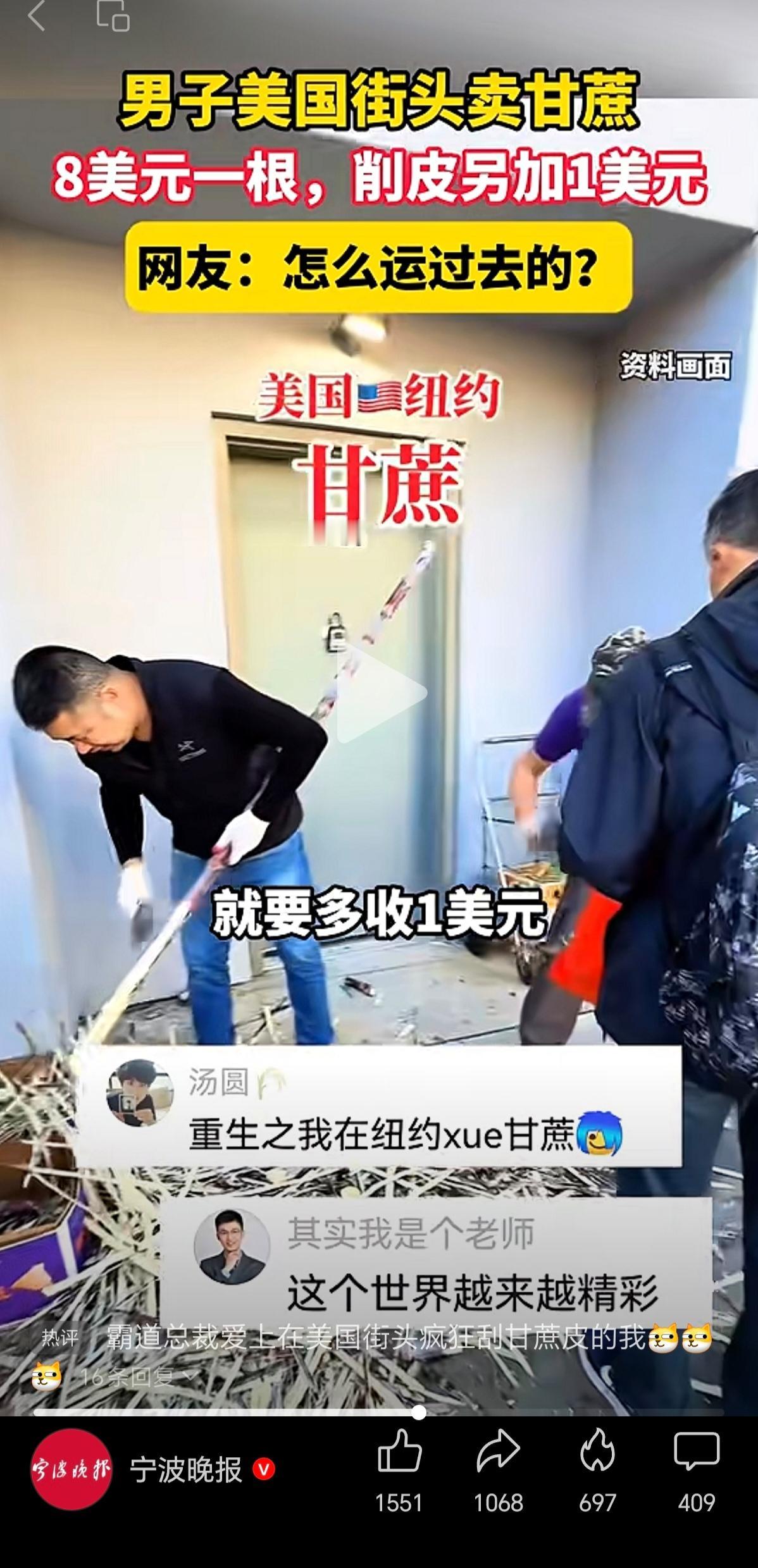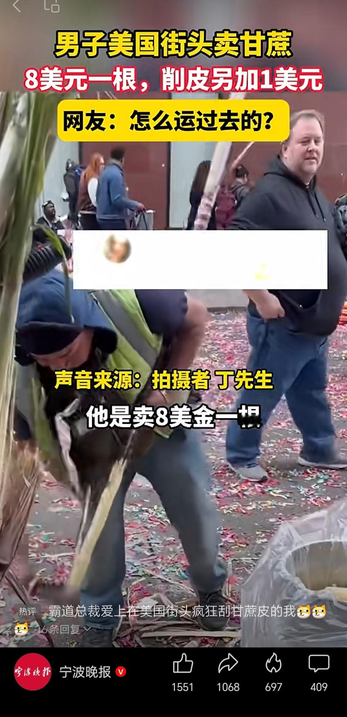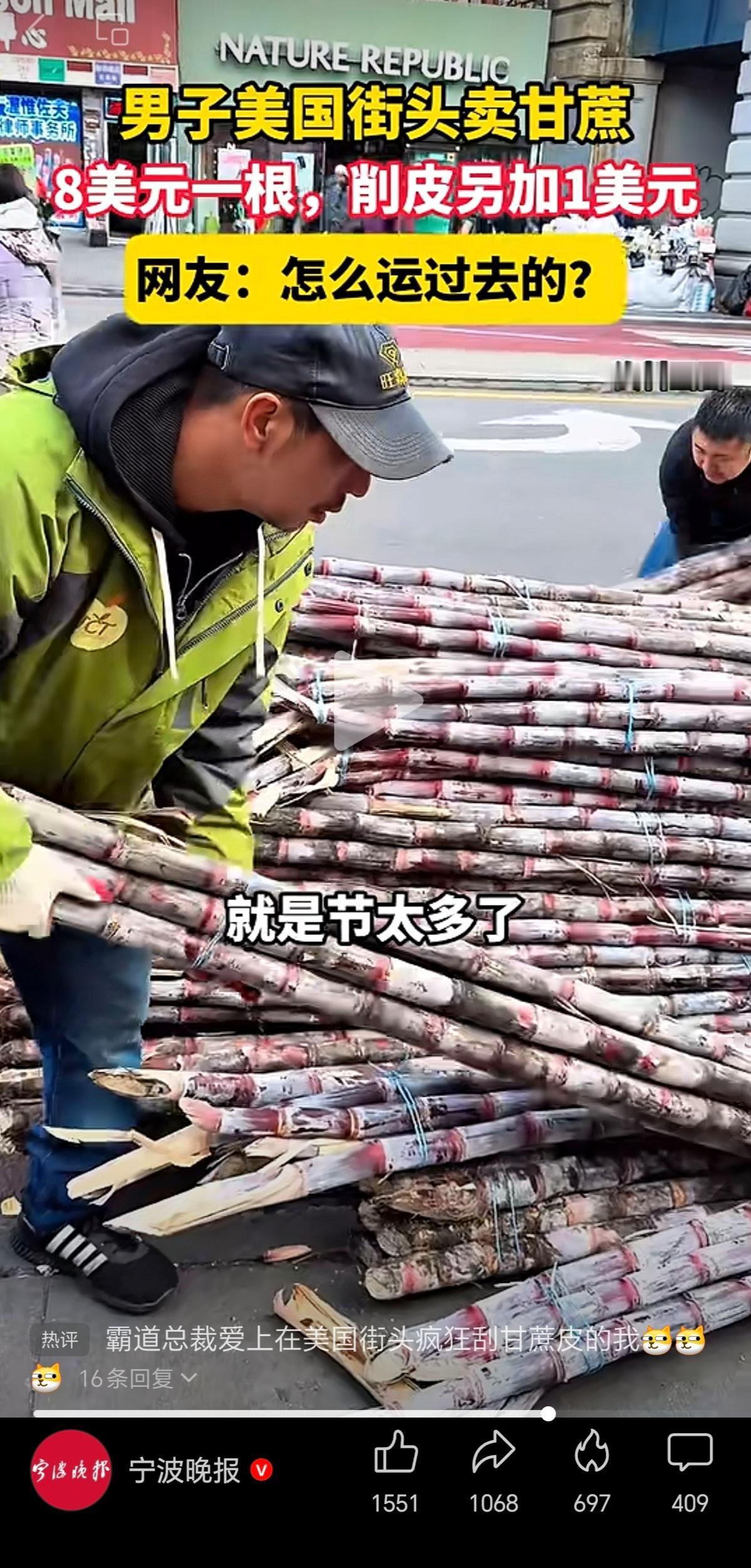 美国纽约街头,也卖起甘蔗来了。售卖价格是8美元一根,如果要加工,需要另外付1美元的加工费。这个价格,看起来,还是有点高的。 但是如果这些甘蔗是漂洋过海,从亚洲运送到美洲的。那么这个甘蔗加上运费,关税等,卖8美元一根,也就不算贵了。这样看起来,还算是在合理范围内的。 甘蔗有些时候,吃吃也是挺有意思的,就当锻炼牙口。不知道,纽约街头购买甘蔗的老外们,是否吃的习惯。牙口不好的话,估计也吃不了甘蔗。 不过话又说回来,这些甘蔗如果是从亚洲运送过来的。那么漂洋过海,一整趟下来,需要多久呢?一个月时间够不够? 而且,加工费1美元一根,看起来也挺不错的。这个世界就是这么精彩,甘蔗文化,也传到美洲了。正如网友所说,如果拍成短剧,可以来一部《重生之我在美洲削甘蔗》,是不是很有趣。