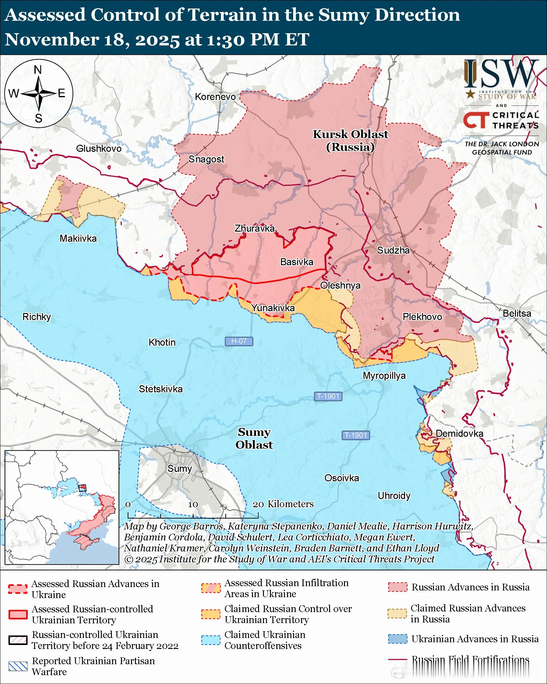 北方轴心俄罗斯的目标:在乌克兰北部沿国际边界建立可防御的缓冲区。11月18日俄军继续在苏梅州北部发动有限的地面进攻,但并未取得进展。11 月 17 日和 18 日俄军在库尔斯克州和苏梅州发动进攻,包括苏梅市北部靠近金德拉季夫卡和安德里夫卡的地区,以及苏梅市东北部靠近尤纳基夫卡的地区。俄罗斯军事博客作者声称,乌克兰军队在金德拉季夫卡和安德里夫卡附近进行了反击。据称与俄北方集群有关联的一位军事博主声称,在列宁格勒军区第44军第72摩步师第30摩步团第3营遭受重创后,俄军指挥部将该营残部调至第30摩托化步兵团第2营。该军事博主还声称,指挥部将第3营的军官团调往被占领的卢甘斯克州招募新兵。该军事博主还声称,第2营随后接替了第3营在奥列克西夫卡的防务。该军事博主还声称,俄第1427摩步团(第11集团军)指挥官正在处理前线撤离问题,但仅该团第1营就有至少331人在过去六个月中未能从特特基诺、雷日夫卡和波波沃-列扎奇(均位于苏梅市东北部)附近的战场撤离。该军事博主还声称,俄第51和第119空降团(均隶属于第106空降师)正在进攻尤纳基夫卡南部,但未能成功,并且俄军指挥部正在逐步撤回第119空降团第2营,以休整自2025年8月以来在该地区作战的部队。作战序列:据报道,俄第 106 空降师的炮兵部队和 (FPV) 无人机操作员;第 7 空降师第 56 空降团和第 83 独立空降旅;以及鲁比孔先进无人技术中心的无人机操作员正在苏梅方向作战。
