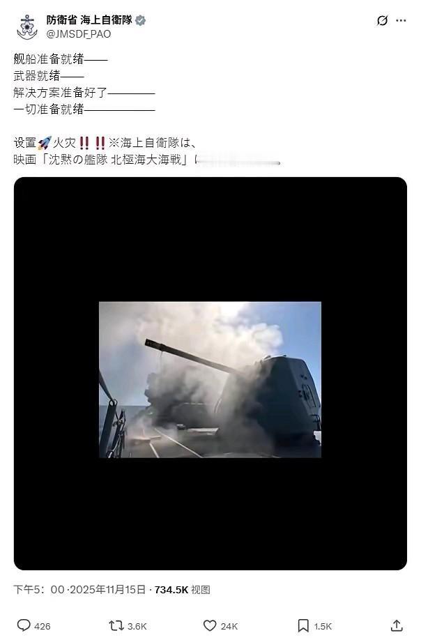 太嚣张了! 11月15日,日本海上自卫队在其官方账号上发布了一段它们参与的电影《沉默舰队:北冰洋大战》的片段,并配文: “舰艇就位—— 武器就位—— 解决方案就位—— 一切准备就绪—— 开火!!” 赤裸裸的挑衅!敢挑衅那就一定要兑现承诺,正是检验我们人民子弟兵战斗力的时候了!